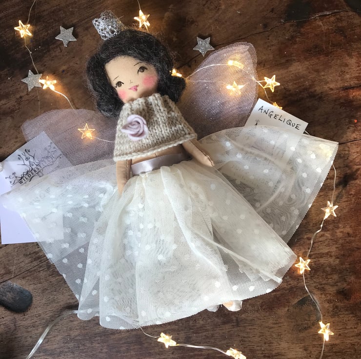 Angelique is approx 10" tall and hand made by Erica-Jane Waters. She is stitched from cotton and her fairy skirt is gorgeous floaty tulle.