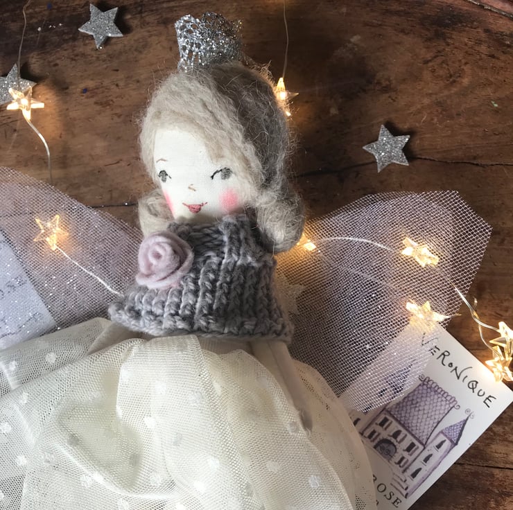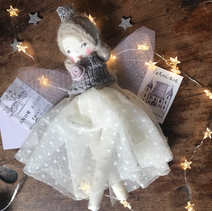 Veronique is approx 10" tall and hand made by Erica-Jane Waters. She is stitched from cotton and her fairy skirt is gorgeous floaty tulle.