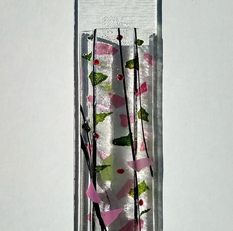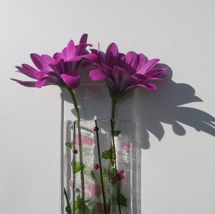 Add a hint of spring to any room with this fused glass wall vase. The Apple Blossom abstract design comes in different shades of pink and green glass to suggest the delicate flowers on an apple tree.
