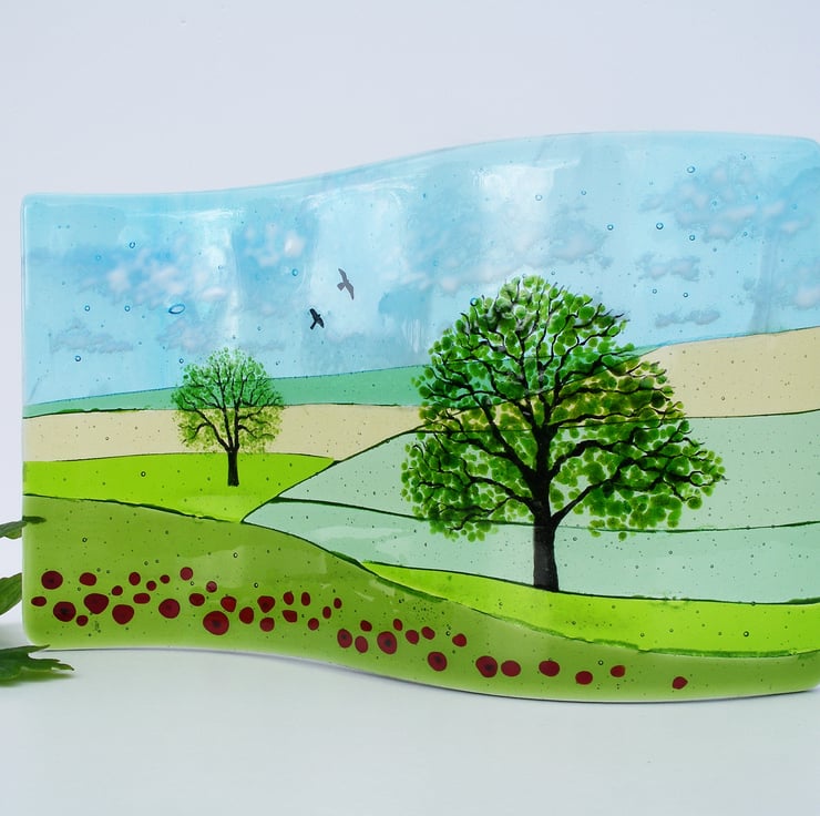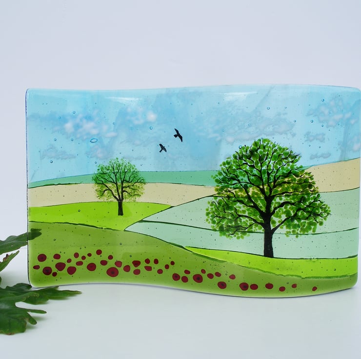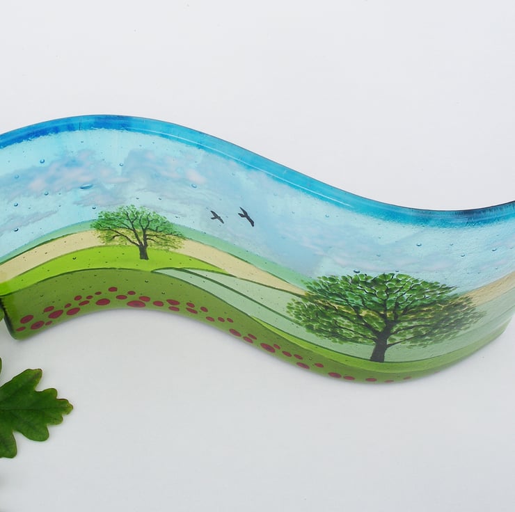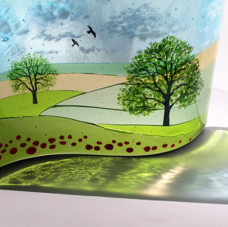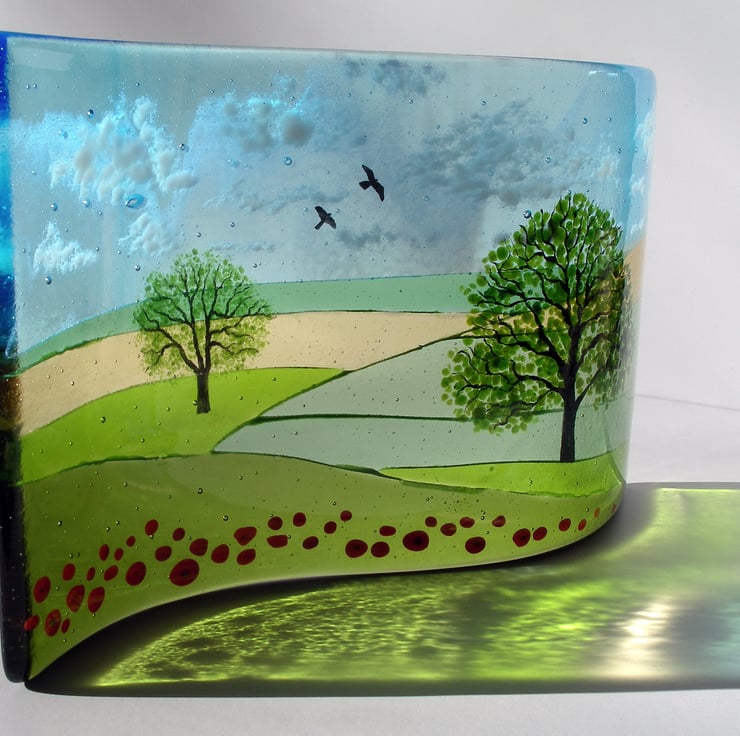 This made-to-order freestanding fused glass Oaks and Poppies fused glass wave captures a snapshot of the summer countryside with its rolling fields I love so much. In an S shaped design, it features my favourite tree the oak, which is hand-painted, poppies in the foreground and a few hand-painted birds against an ethereal sky.