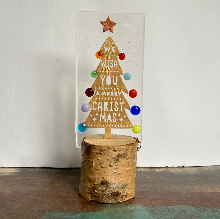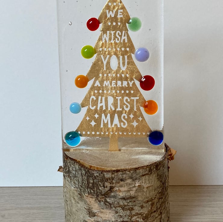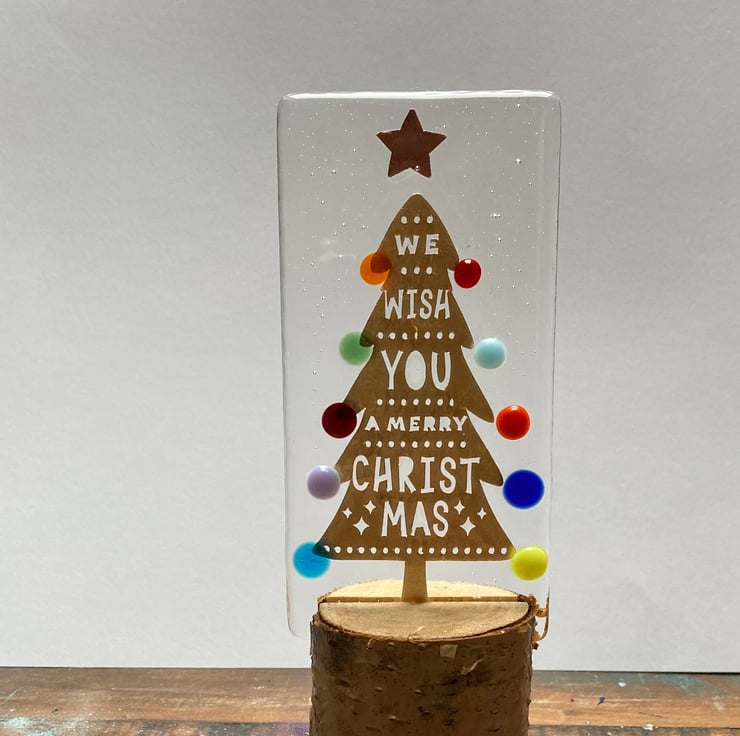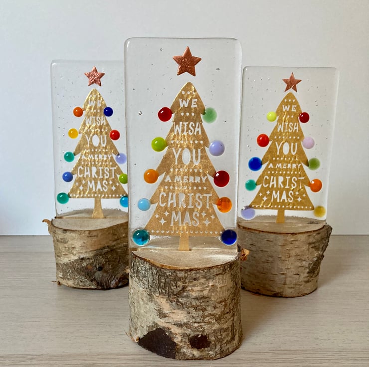 Decorative golden fused glass Christmas tree, each tree has “we wish you a merry Christmas” cut within the metallic. Then 10 different brightly coloured baubles on the branches. Each tree is fused between two layers of bullseye glass. They are then set into a natural tree stump base.