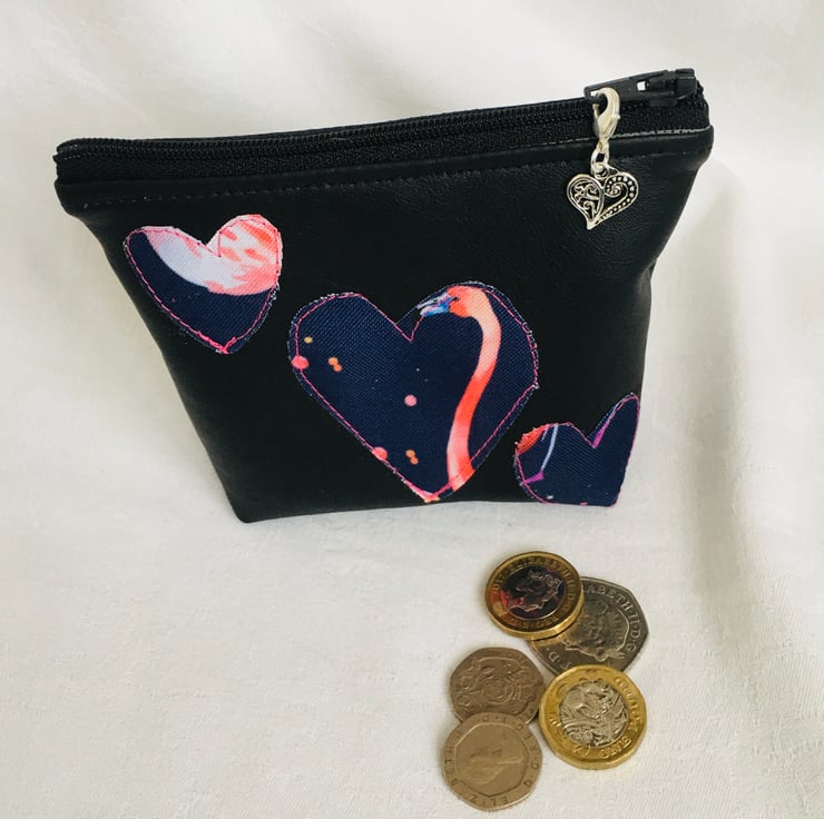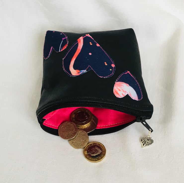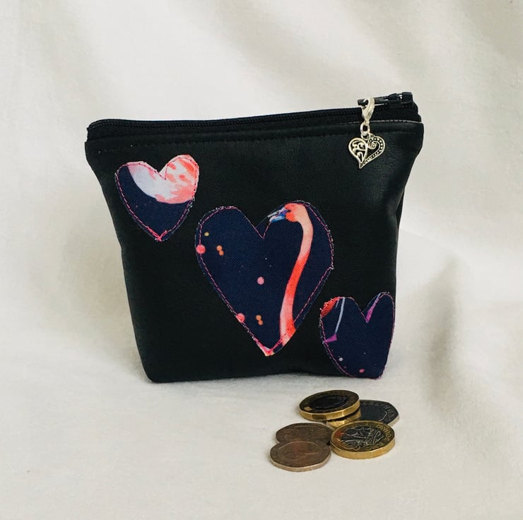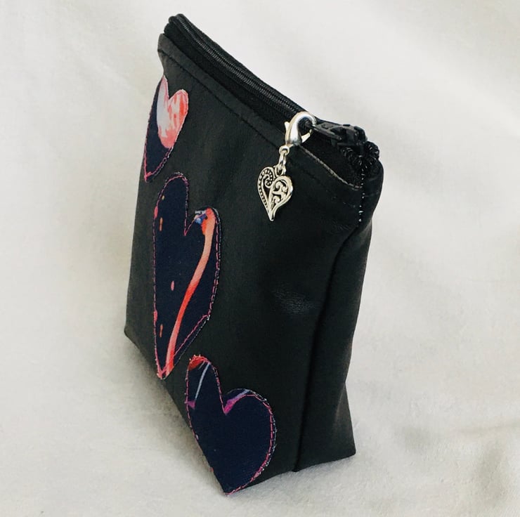 The purse has been made from faux leather, and heart's appliqued onto the front. Fully lined with cotton fabric and finished with zip across full length on top and finished with a pretty heart zip pull charm.