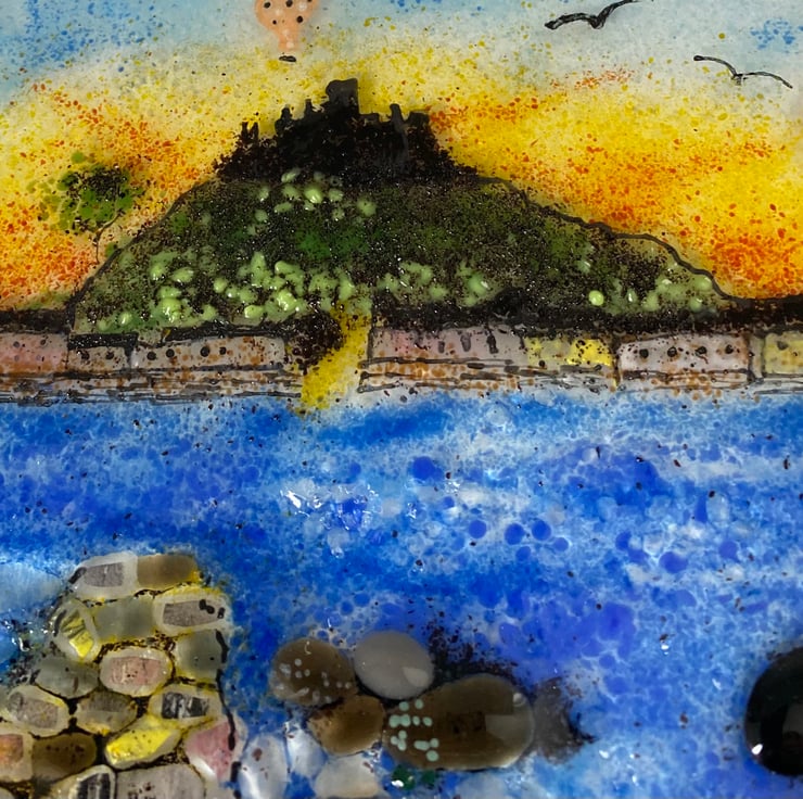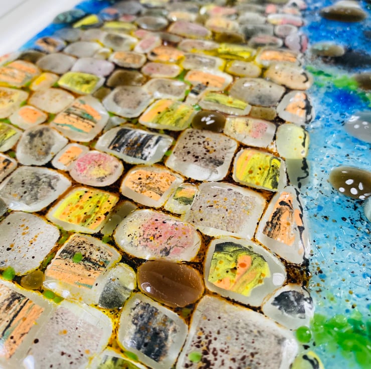 Stunning contoured fused glass picture which is built up using glass powders and frit. The landscape is of a sunset with distant hot air ballooons. The overall size of the picture frame is 15inch x12inch . The picture can either hang directly on the wall or be free standing . The cobblestones have lots of contour and colour . You are buying a one of a kind fused glass piece of art.