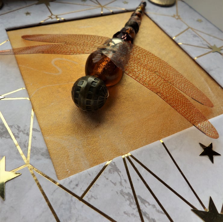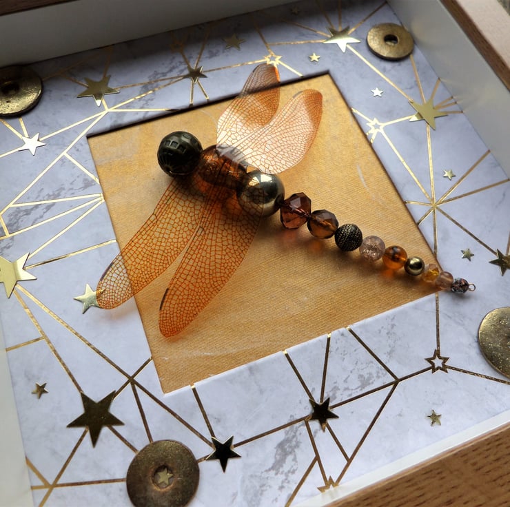Tones of amber, gold and topaz give a glow to this starry Beaded Beasties frame. The title comes from the astronomical chart style of the paper that covers the outer mount board with its geometric lines dotted with printed stars and to which more metallic stars have been added along with golden washer beads. In the centre, the background has a golden, hand-marbled paper.