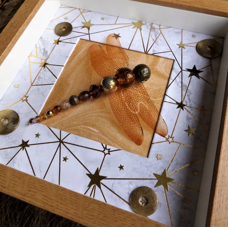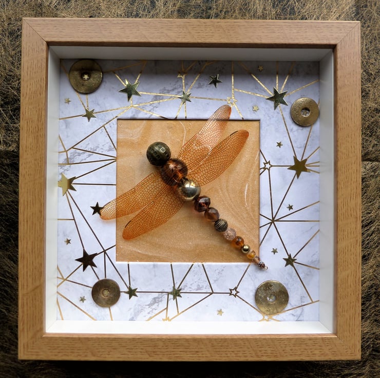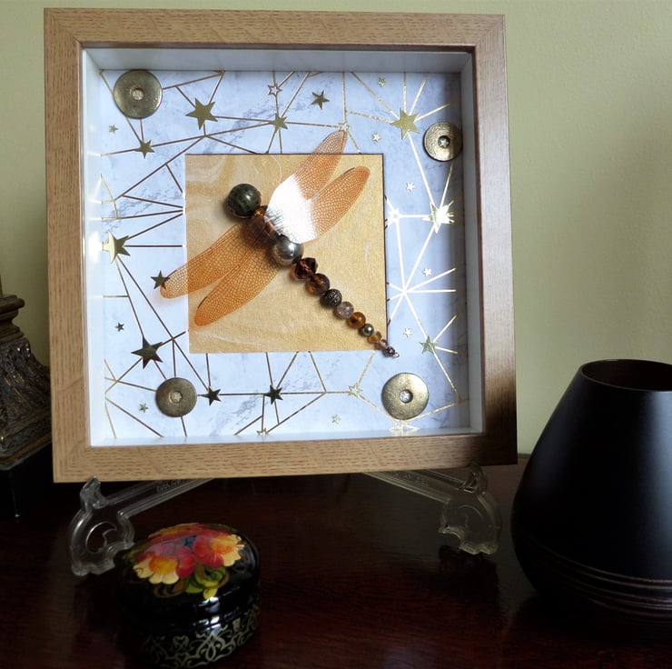 Hello and welcome! This page is home to Beaded Beasties: mixed media box frames of dragonflies and other creatures within an environment. Each one unique, made from new and recycled materials. I hope you love what you see.