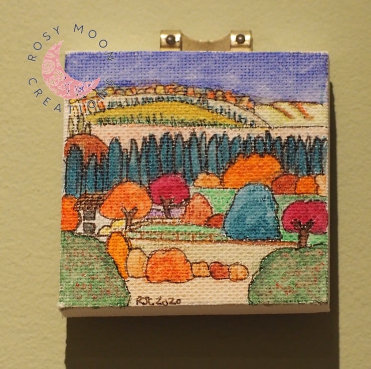 A 7x7 canvas watercolour with a view of the Surrey Hills in Autumn.