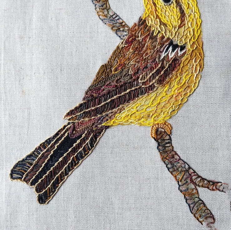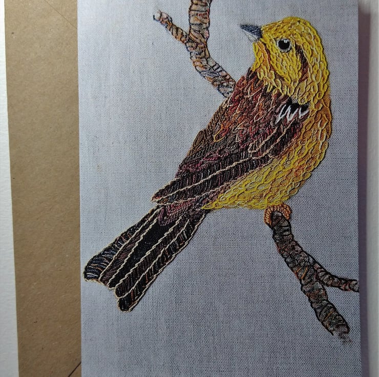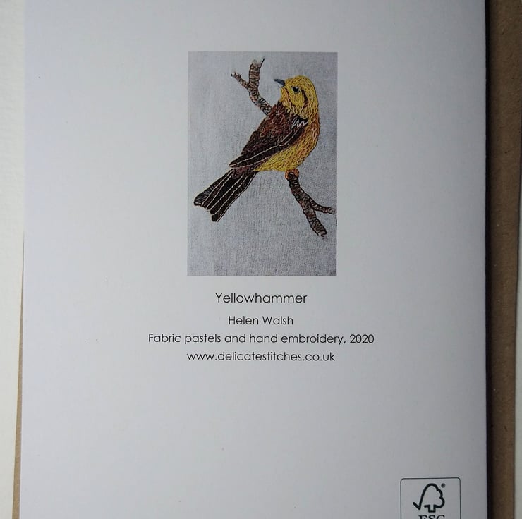 Yellowhammers have a very distinctive call and they really are incredibly yellow! This card is a photographic print of my textile portrait of a yellowhammer, created with hand embroidery and fabric pastels.