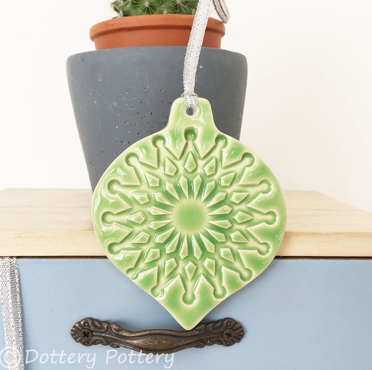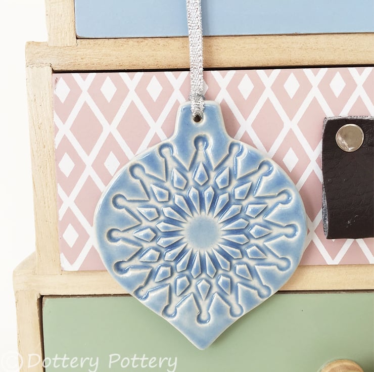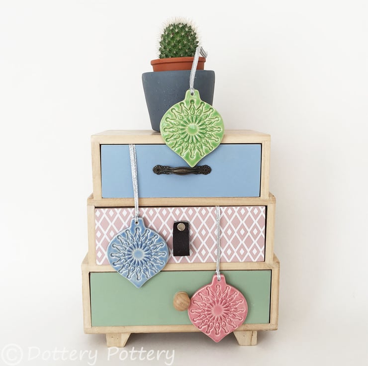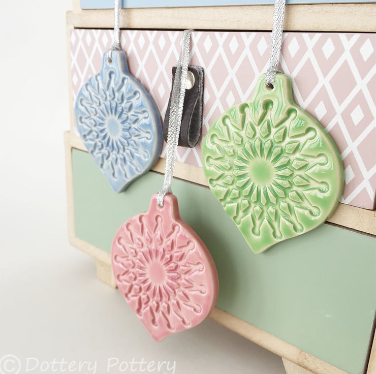 These ceramic bauble decorations have an imprinted design and are finished in gorgeous pastel, glossy glazes. They are made from white earthenware clay and fired once, then glazed and fired again. They measure 8cm length and 7cm width and 5mm deep and hang from a silver ribbon, Glazed on the front only. They would look perfect in a modern interior.