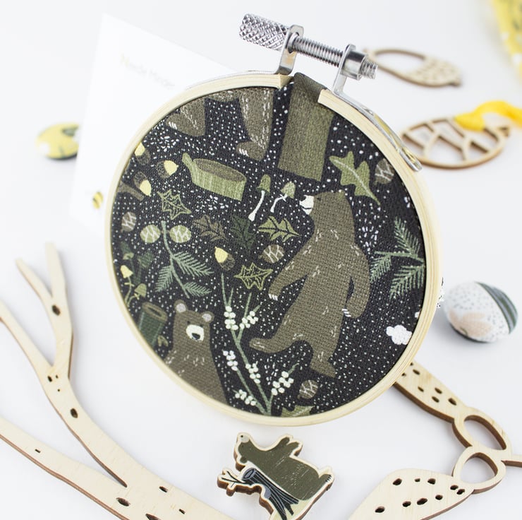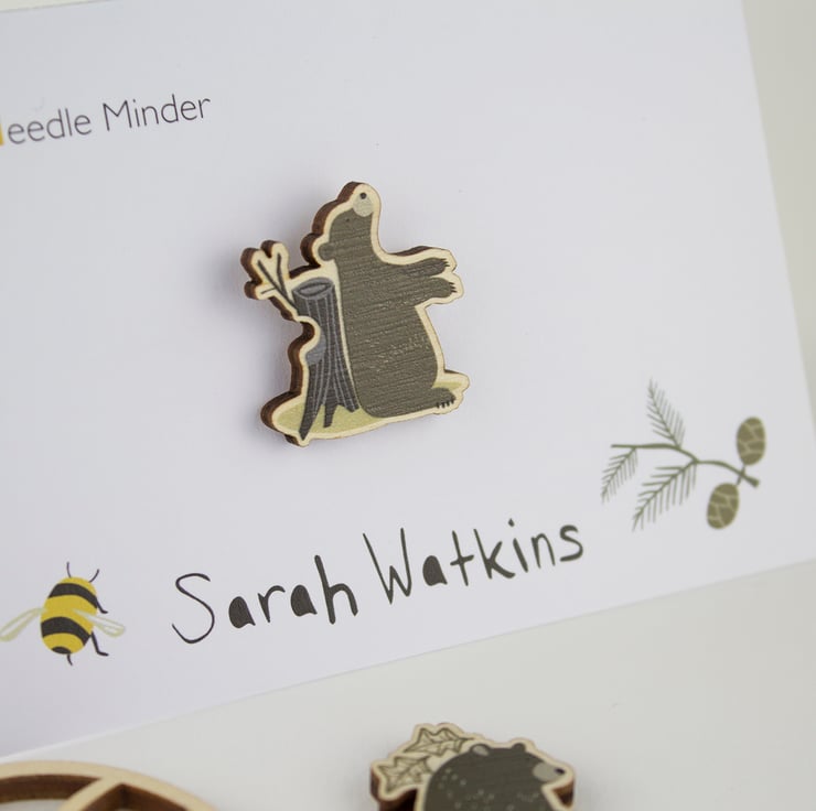 Very cute magnetic wooden pin minder bear. The cheeky bears have been designed by us, and they feature on our fabrics. The bear measure 24mm. It is magnetic, and can be held in place on your embroidery or cross stitch project without marking your fabric. The magnetic bears are also supplied with a lucky penny on the reverse of the presentation card making them a lovely good luck gift for friends and family. They're also a lovely way to send a big bear hug to someone special.