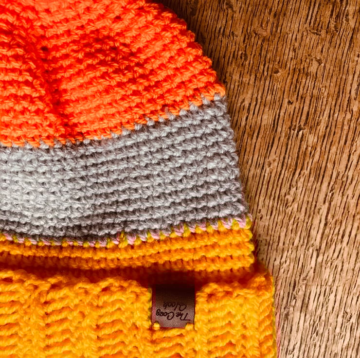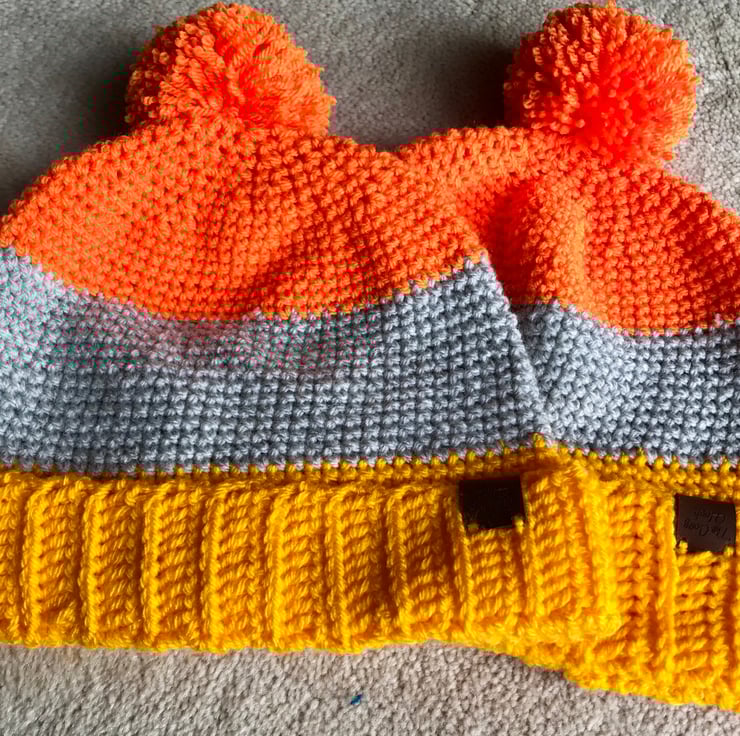A bold statement of a hat in vibrant orange and yellow Sandwiched around light grey. Completely eye catching with a folded brim to keep little ears extra warm and a super pom-pom on top.