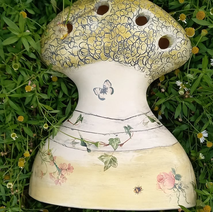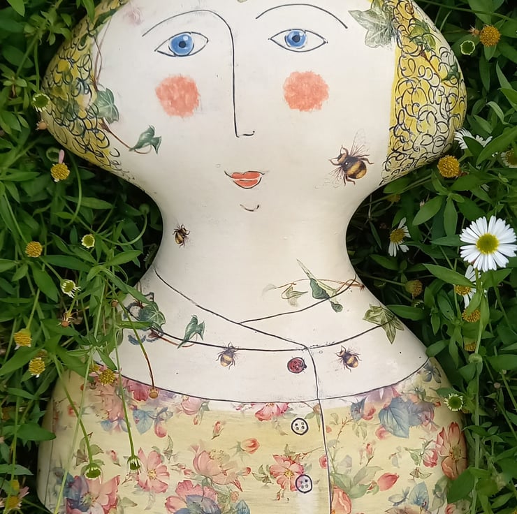 Hand built figurative vase measures approximately 23cm in height.Hand painted with coloured slips and glazed in a transparent glaze .Ceramic decals of birds bugs and flowers are fired on to add detail. Openings at the back of her head allow for dried flowers or grasses. Will be carefully packed and posted.