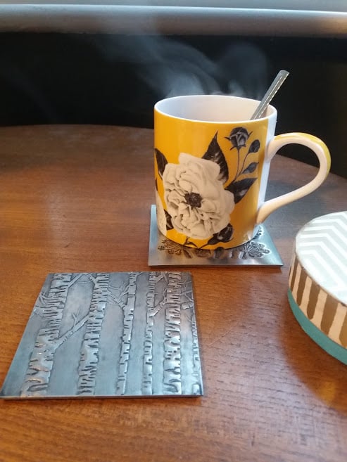 Embossed square pewter coaster depicting imagery which was drawn by Laura.These drawings were made into tooling which transfers her images onto the pewter in a rolling process.They have a brushed antique finish and are corked on the reverse. 9cm x 9cm