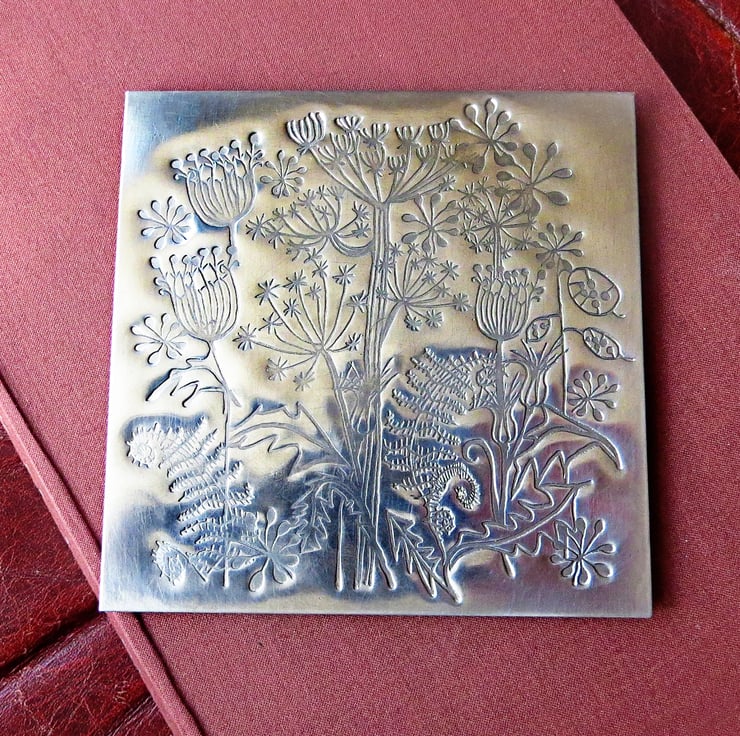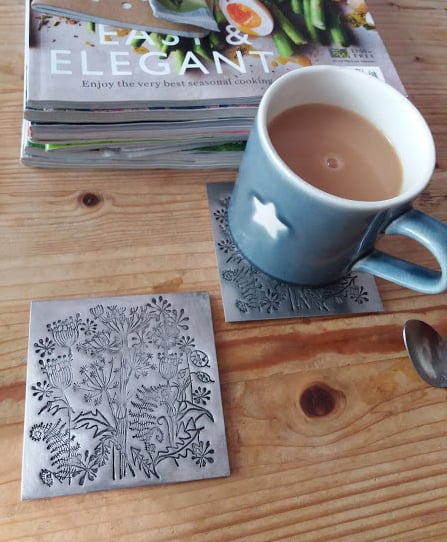Embossed square pewter coaster depicting imagery which was drawn by Laura.These drawings were made into tooling which transfers her images onto the pewter in a rolling process.They have a brushed antique finish and are corked on the reverse. 9cm x 9cm