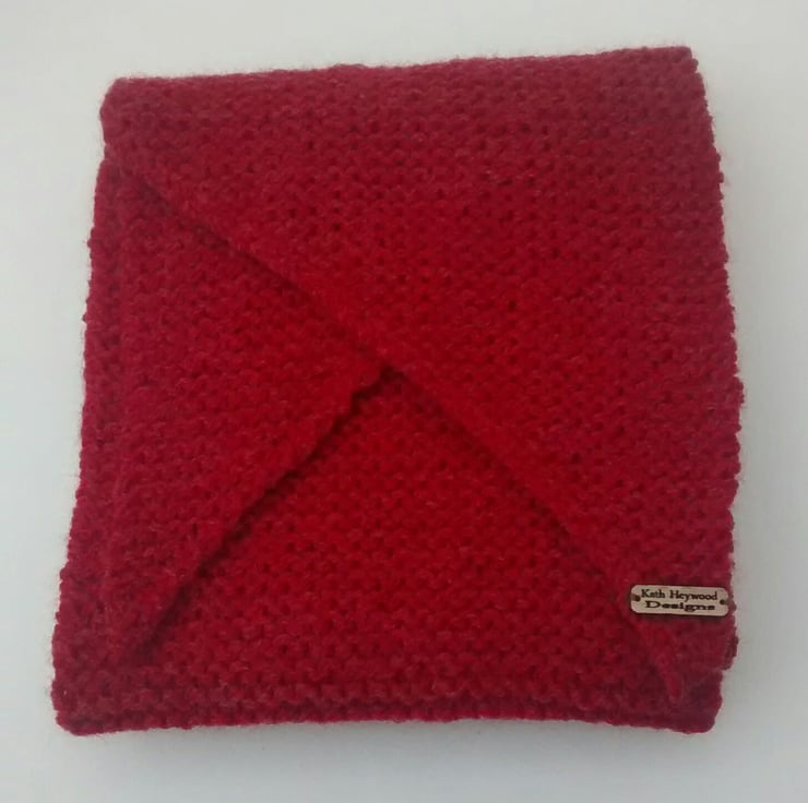 Soft and cosy hand knit scarf in a wool/acrylic blend yarn in a gorgeous shade of cherry red to brighten up any outfit.