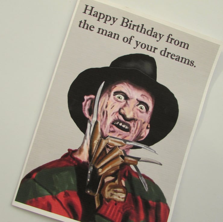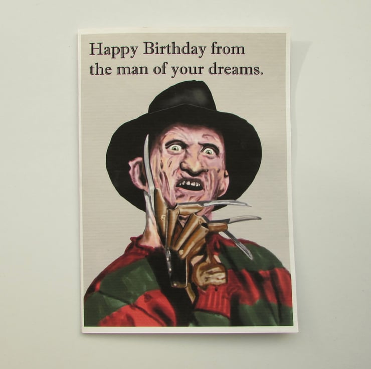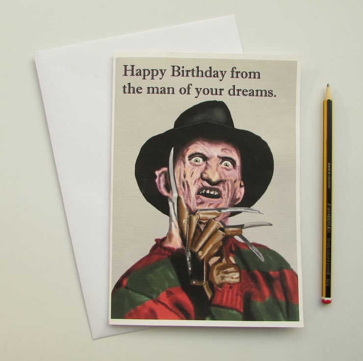 Hand made card with original art by The Shabby Artist. The card is inspired by the film character Freddy Kreuger of A Nightmare on Elm Street.