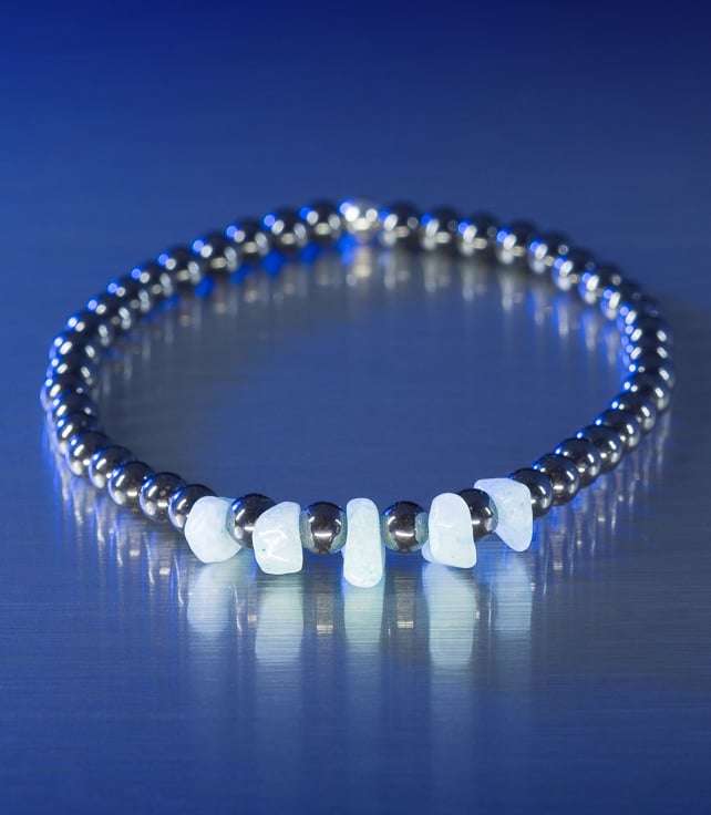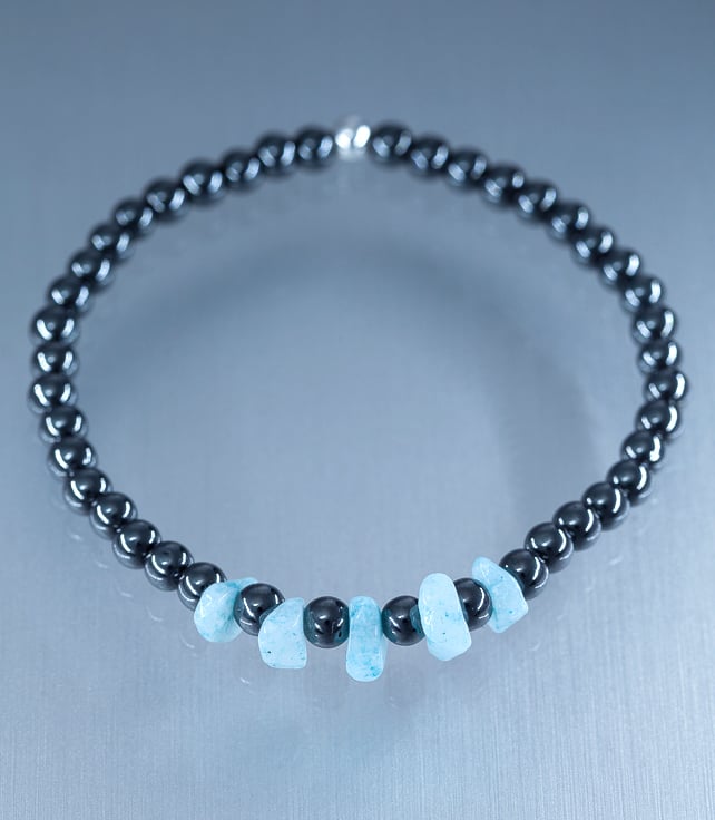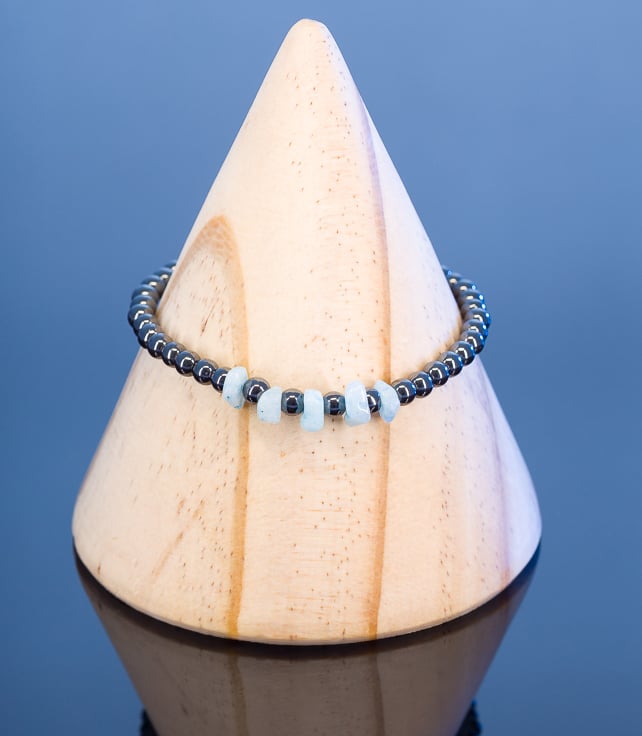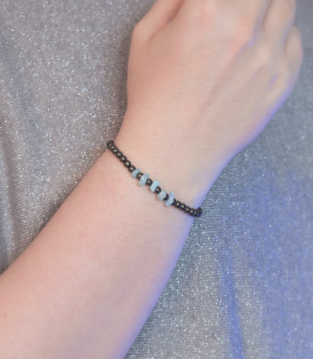 Hematite beads make really comfy bracelets and the Morganite chips add a unique design feature.