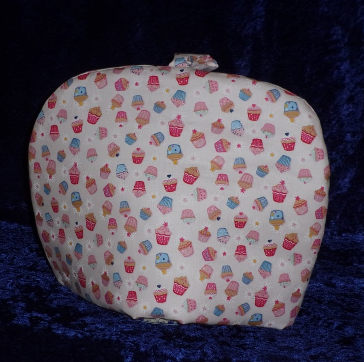 This tea cosy has a design of multi coloured small cup cakes on a very pale pink - almost white background and it is perfect for keeping your tea pot nice and cosy for a couple of hours - it is fully lined with a cream fabric and wadding which has been stitched to the lining to prevent it from bunching up when you have to wash it. It is fully machine washable as the fabric used is 100% American Cotton for the exterior design and poly cotton for the lining.