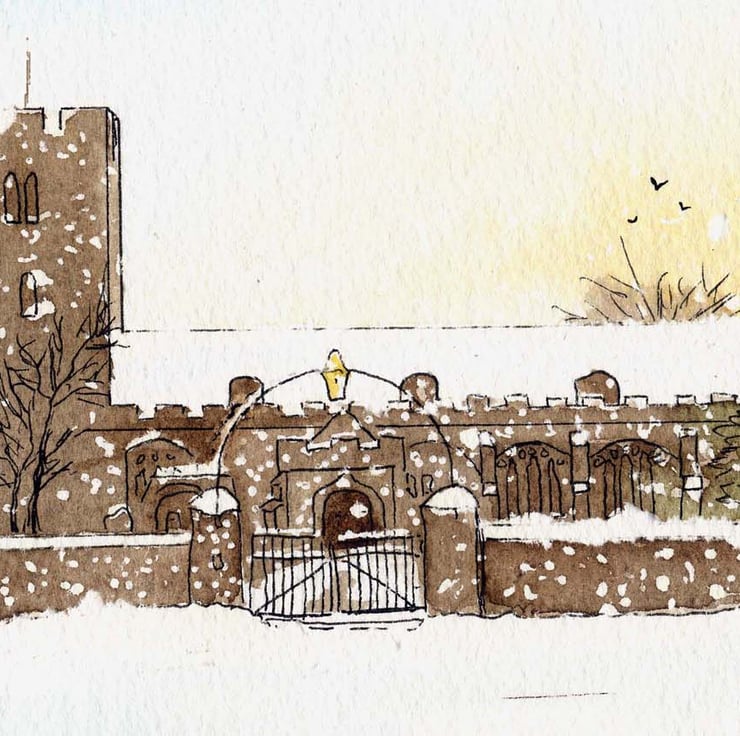 Burnham-on-Crouch is so lucky to have such a pretty and much loved church. I was walking to work in a snow storm and as I always have a camera with me I managed to take this shot and then painted it later when I was in the warm and dry.