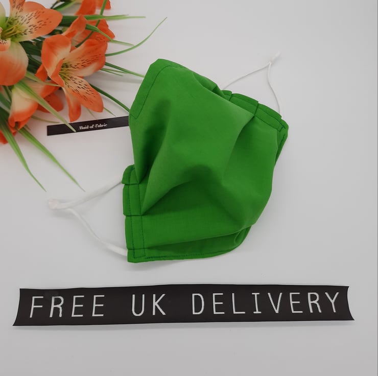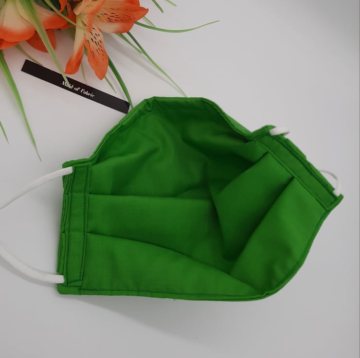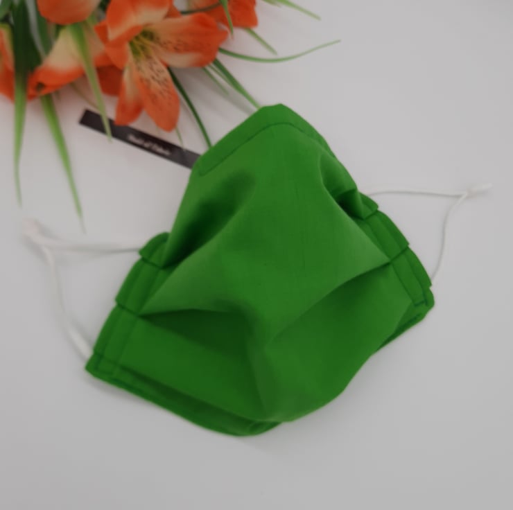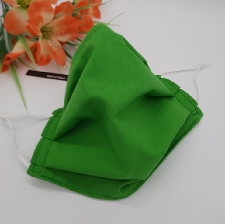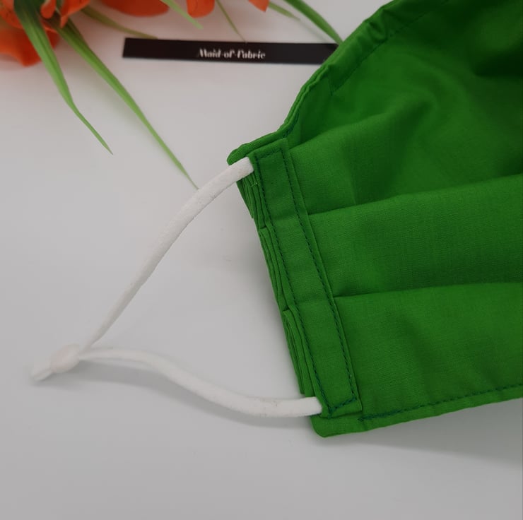 Large green cotton face mask with adjustable elastic and a 9cm flat bendable nose wire.