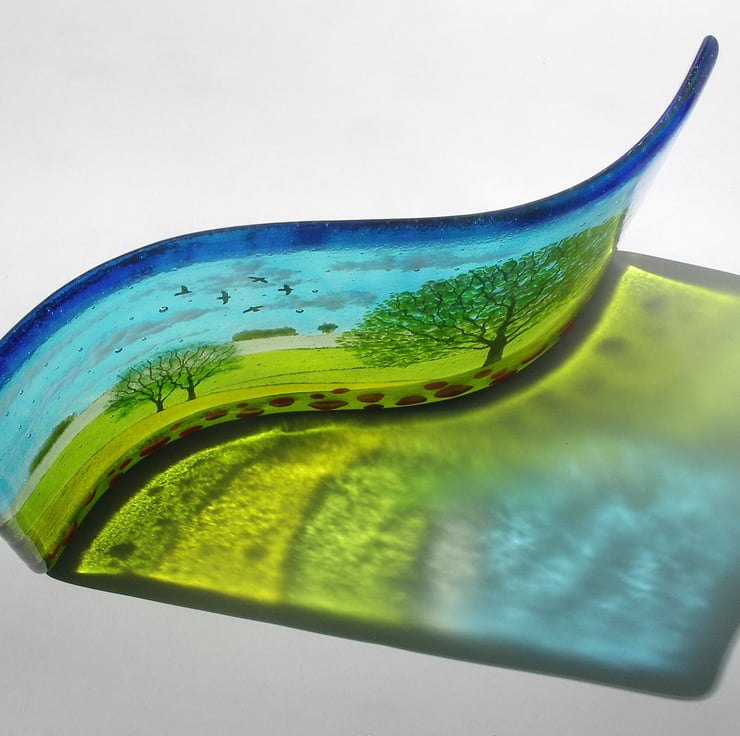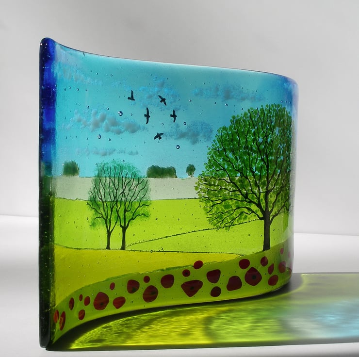 The Poppies and Oaks Landscape wave is inspired by summer walks near my home and in Monmouthshire. As a keen hiker, the rolling countryside in parts of South Wales provides lots of ideas for fused glass pieces. I snap away on my phone as I walk, capturing scenes which I later use back in my workshop.