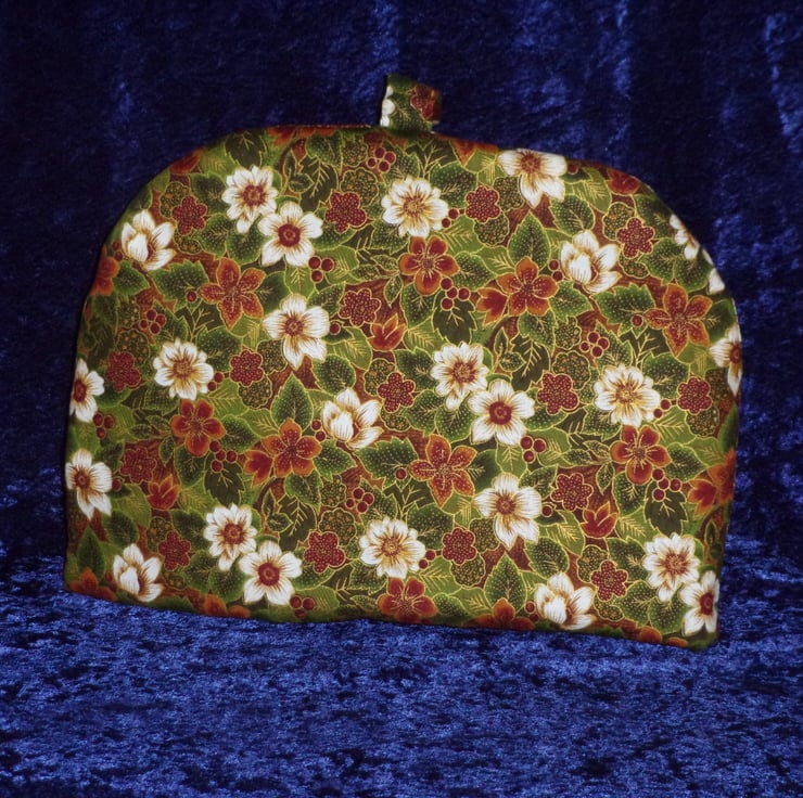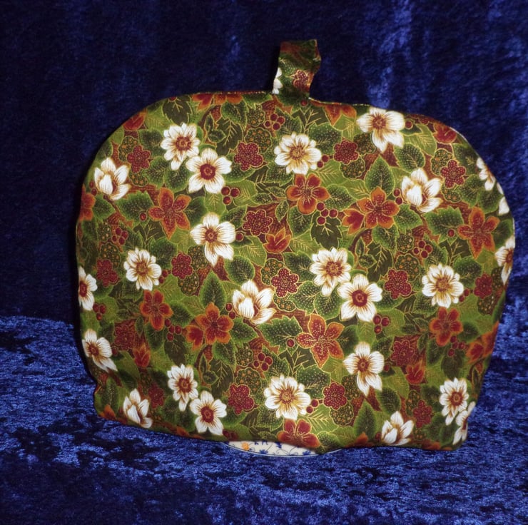 This tea cosy features a design of white Helebores - also known as the Christmas Rose on a dark coloured background and is perfect for keeping your tea pot nice and cosy for a couple of hours - it is fully lined with a cream fabric and wadding which has been stitched to the lining to prevent it from bunching up when you have to wash it. It is fully machine washable as the fabric used is 100% American Cotton for the exterior design and poly cotton for the lining.