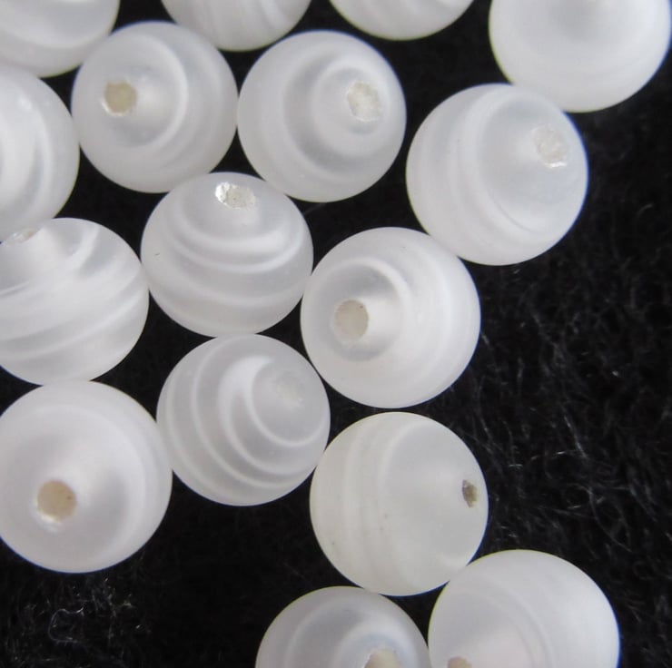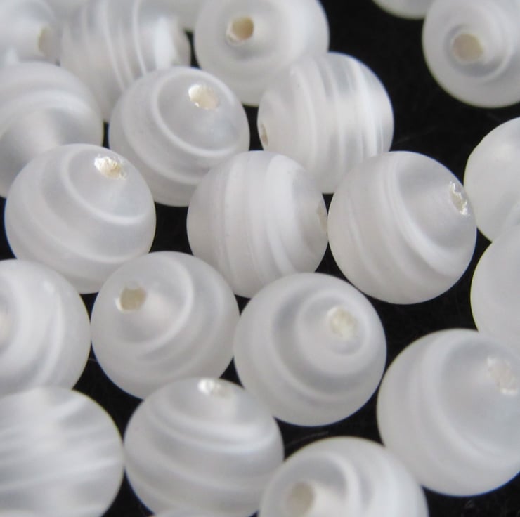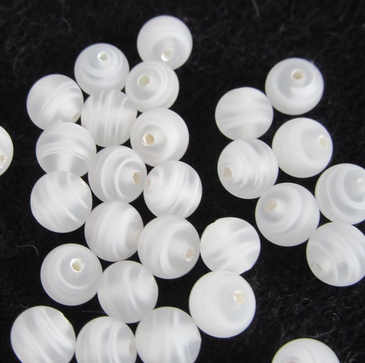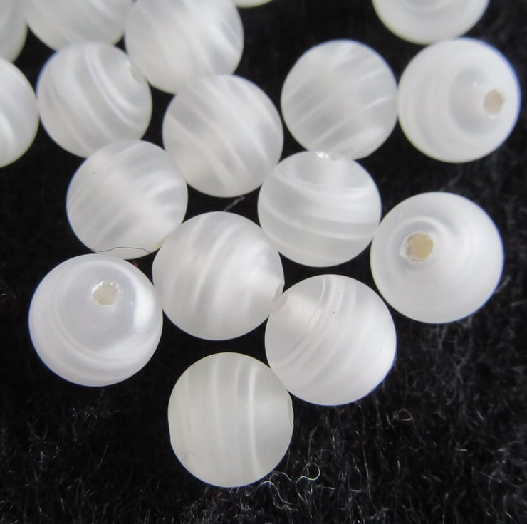 Round glass beads with a frosted matt surface and a translucent and white swirl effect.