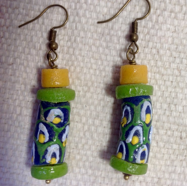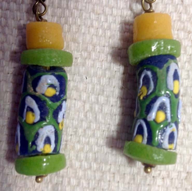 Beads similar to these have been made in West Africa for centuries and were once used as currency. These two have been made from recycled glass, probably old bottles coloured with ground down seed beeds, hence the bright colours. The earrings have been finished with lime green disk beadsand yellow short tube beads, all from Ghana.