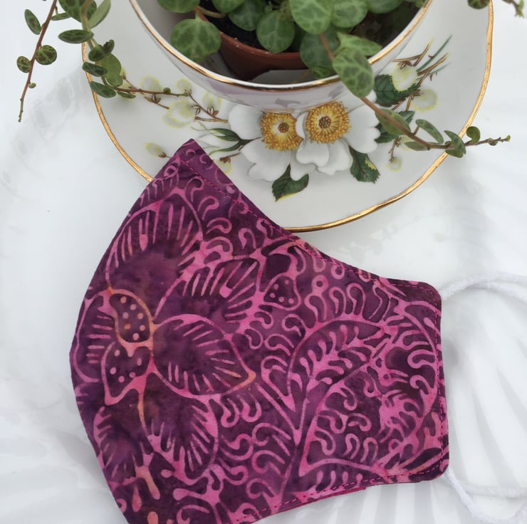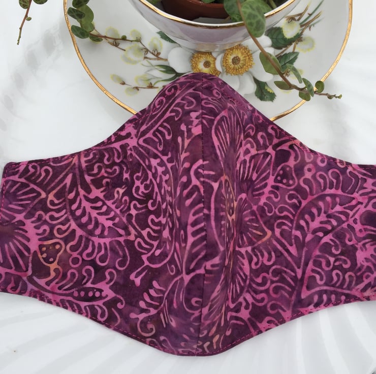 This woman’s, medium size face mask, is made from 100% quality cotton fabric - handmade in the UK - from a lightweight Indonesian batik dyed cotton. Stylish and unique.