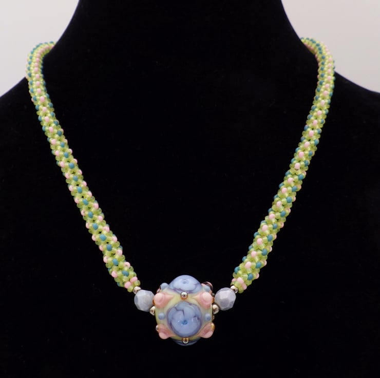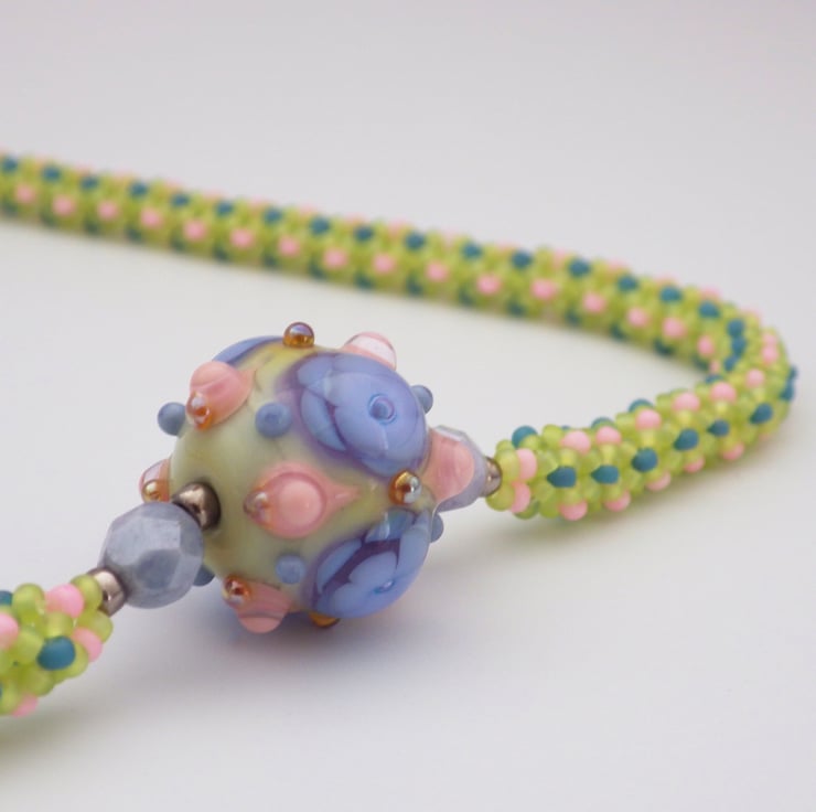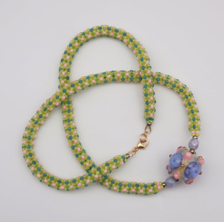 This necklace features a beautiful handmade lampwork glass bead in spring shades of pink, blue, and green, with touches of golden yellow. Much of the added detail has been left raised by the lampworker, giving texture and interest. I have picked out the colours used in quality Japanese seed beads and have beadwoven a chenille stitch rope to form a necklace with a gorgeous draping quality. It has been finished with rolled gold findings, including a secure lobster clasp.