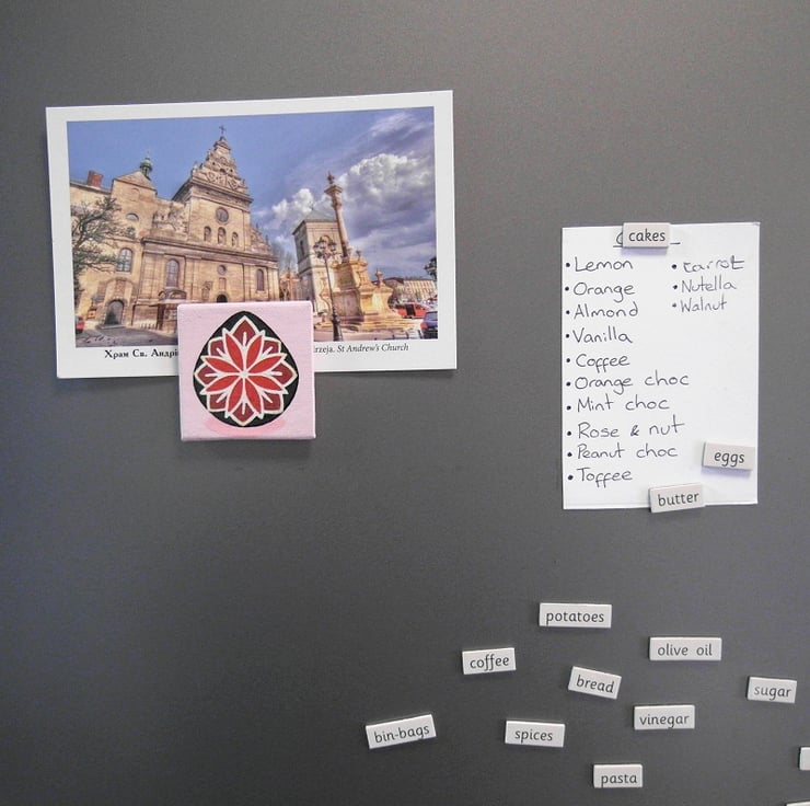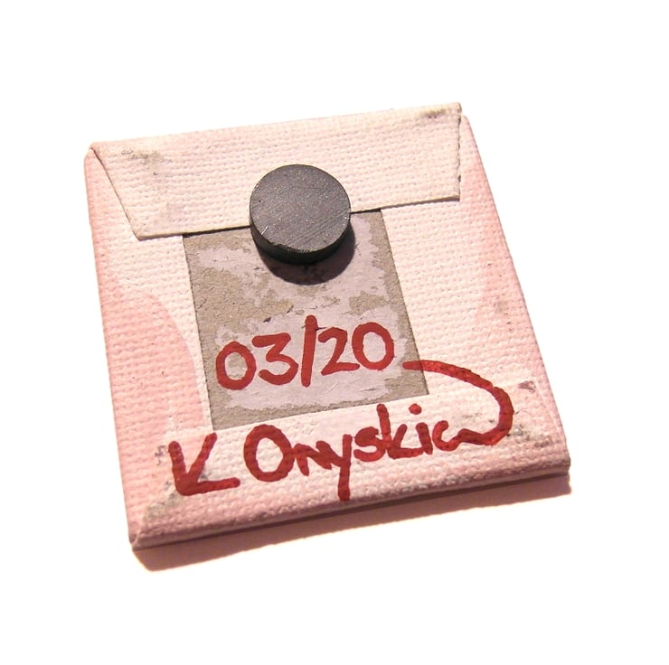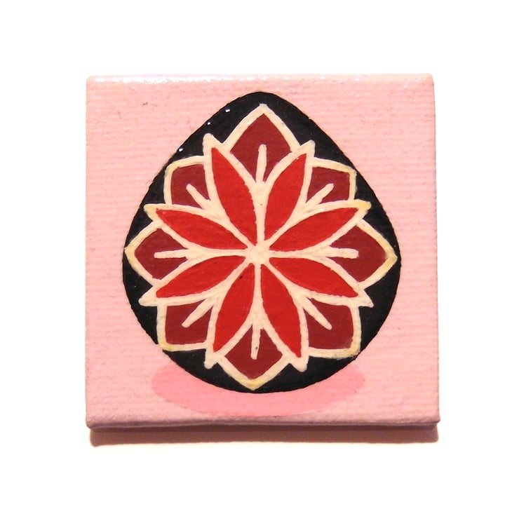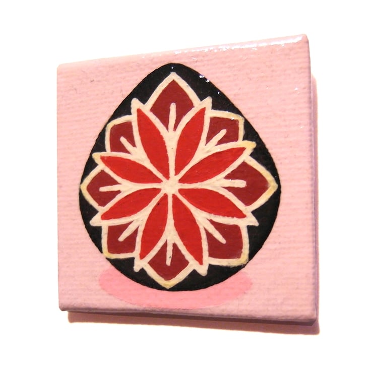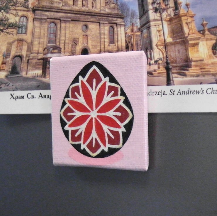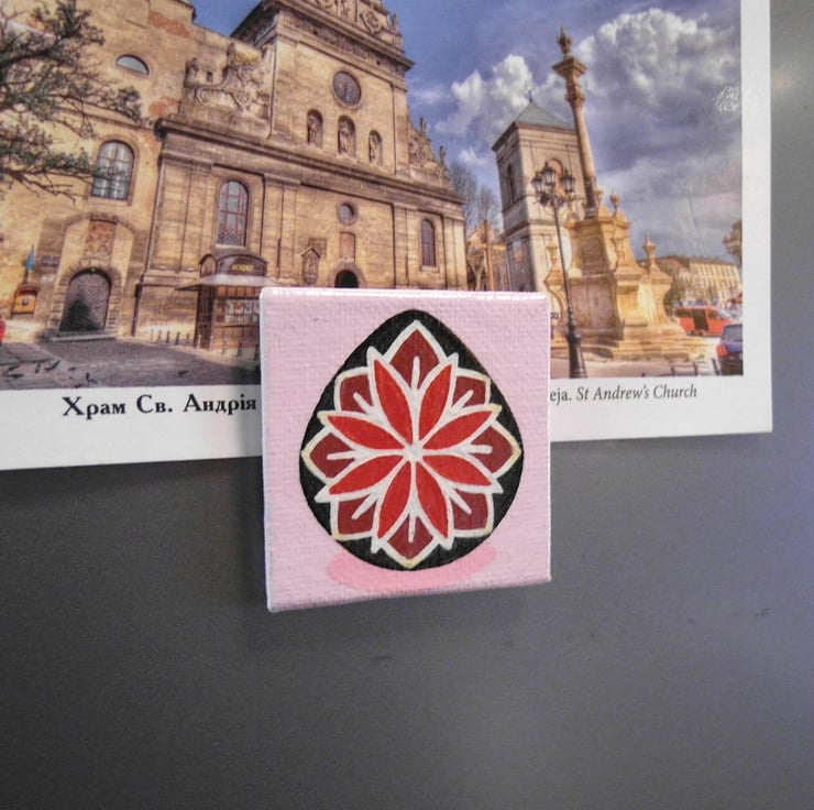 The original pysanka design is painted in acrylics on a 5cm x 5cm (2" x 2") canvas board. The mini art has been coated with a layer of clear varnish to make it more durable, and a 12mm magnet is attached to the back so the little painting can stick on a fridge or other magnetic surface.