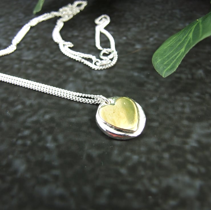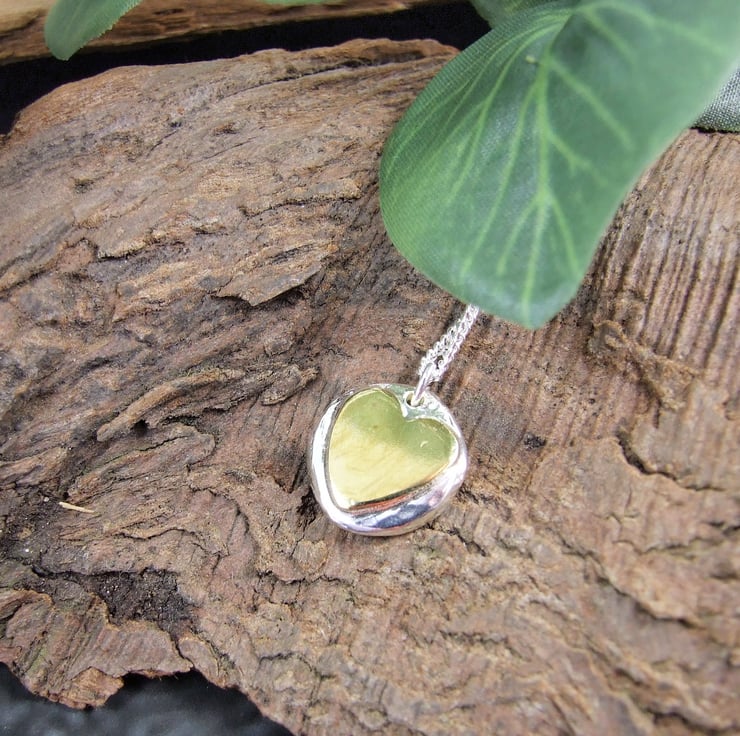 I have created the nugget from molten recycled silver that has been heated until it forms a bead and left to cool. Once cooled and cleaned I have flattened into a coin shape and soldered on a brass heart which I have cut from 0.5mm brass sheet. The nugget is solid silver and has a lovely weight to it and is very tactile. Fitted to an 18inch Sterling Silver Chain.