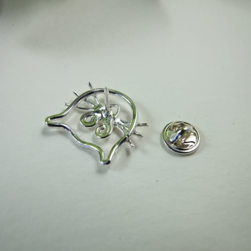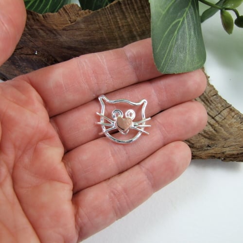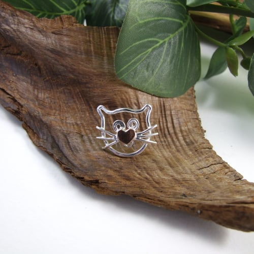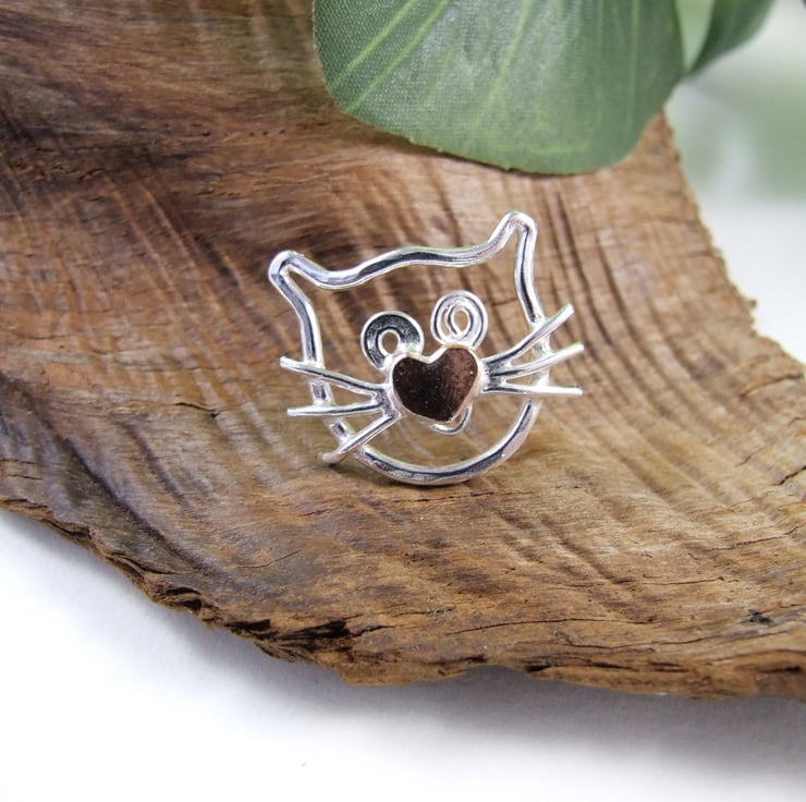 I created this brooch from 1.5mm sterling silver wire, which I have shaped by hand freeform to create a cat face and added a tiny copper heart for a nose. Fitted to sterling silver pin and butterfly clip (also supplied with a push on back)