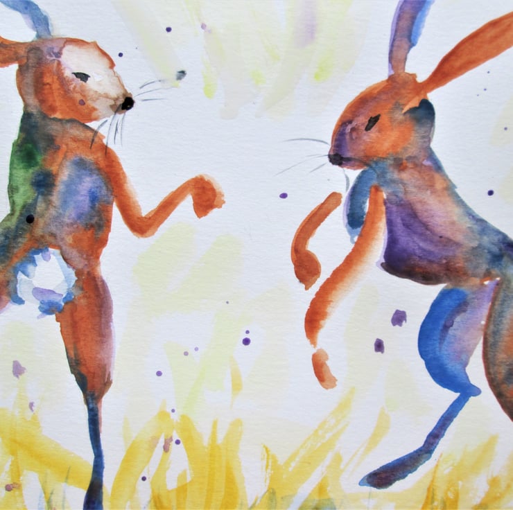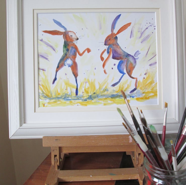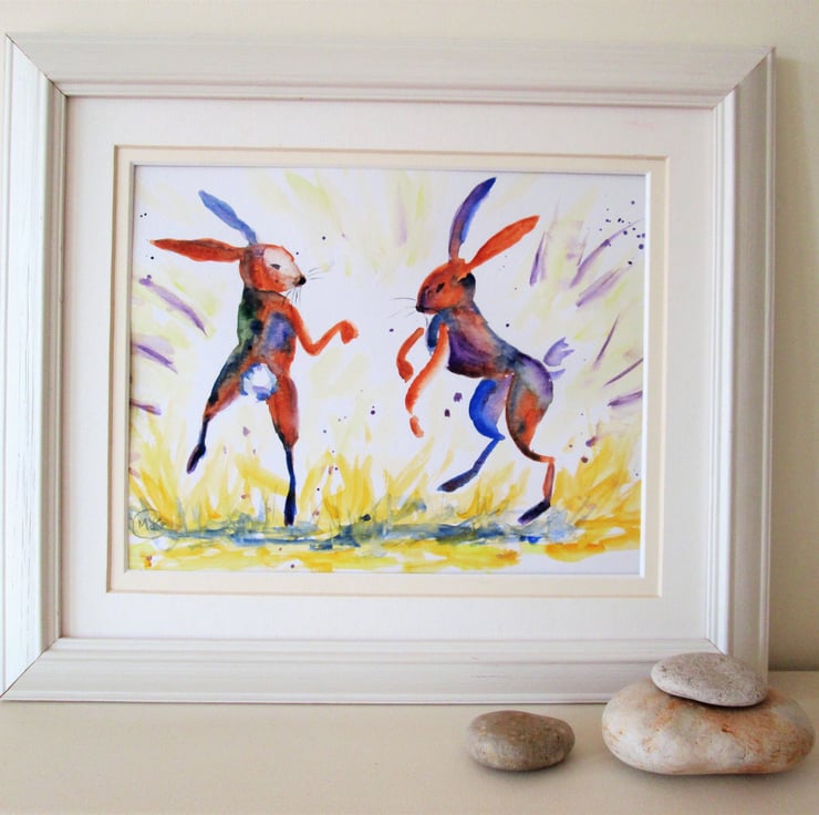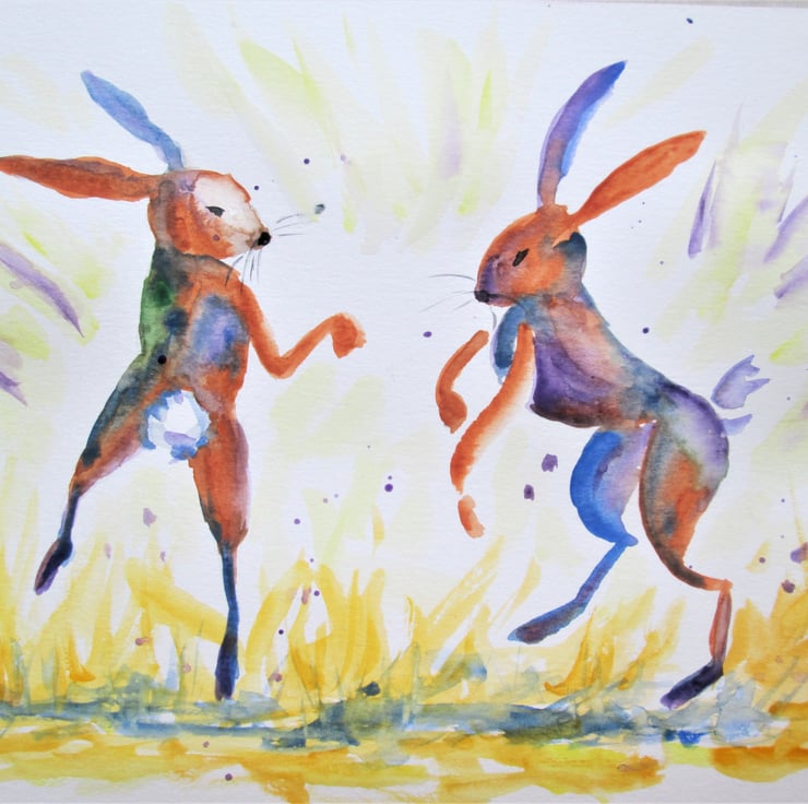 Hares boxing is an original watercolour painting, ready to find a new home. In nature wildlife can be observed to act in peculiar ways. The hare is an interesting animal and has peculiar actions.