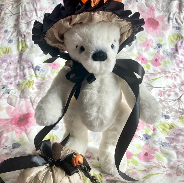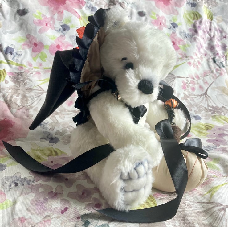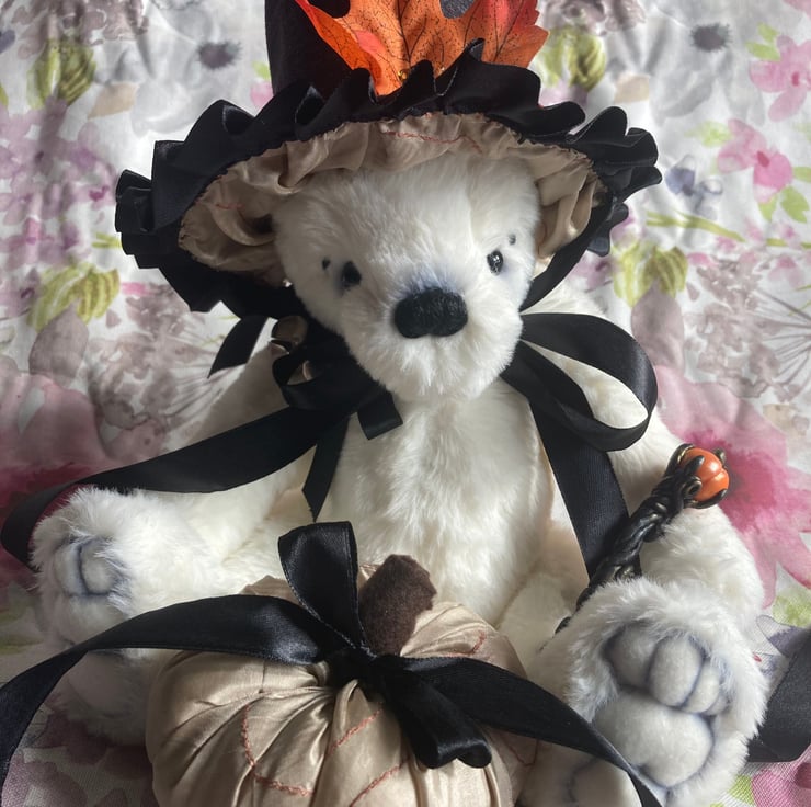 Spencer is a beautiful white polar bear with black accents and decorated with a black ribbon and silver bells. He has a hand sewn wizards hat, a fabric pumpkin and a magical polymer clay staff!