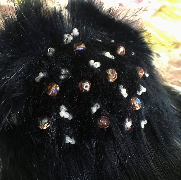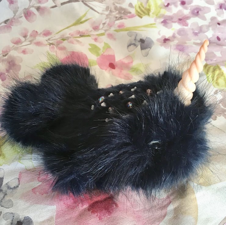 Splash has been hand sewn with an array of beautiful glass beads upon his back, a hand crafted clay horn and glass eyes. Splash is weighted with steel shot so that he feels absolutely lovely to cuddle.