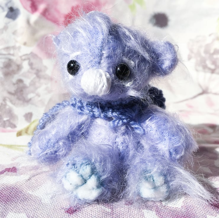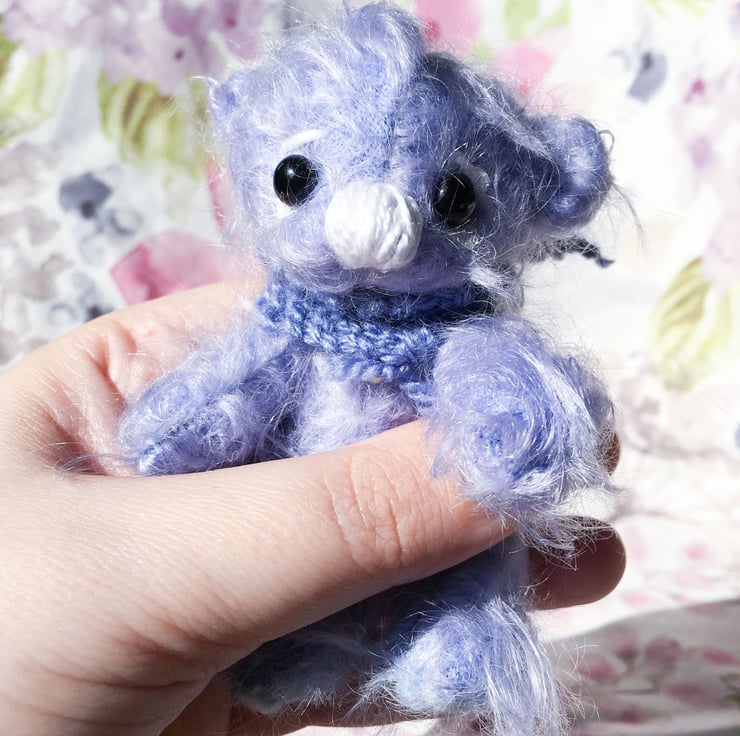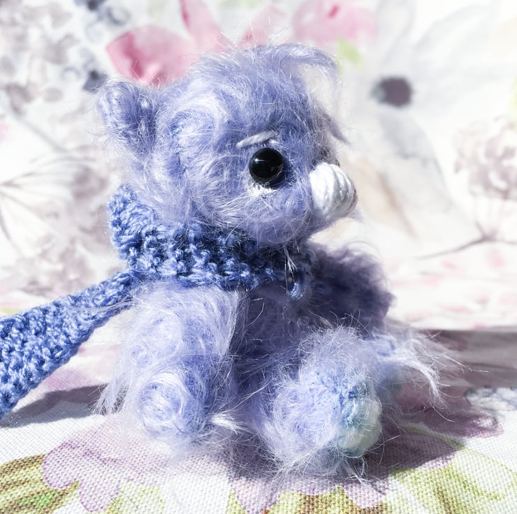 Bronwyn is a miniature teddy bear completely sewn by hand. She is in a beautiful violet blue colour and has a matching knitted scarf around her neck. Made from all new materials.