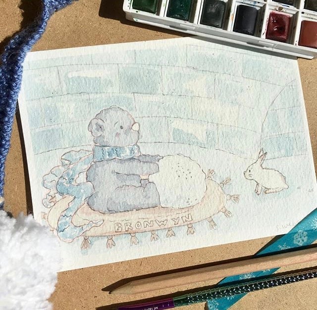 Bronwyn also comes with an original watercolour painting too of her in her igloo with her arctic hare visitor.