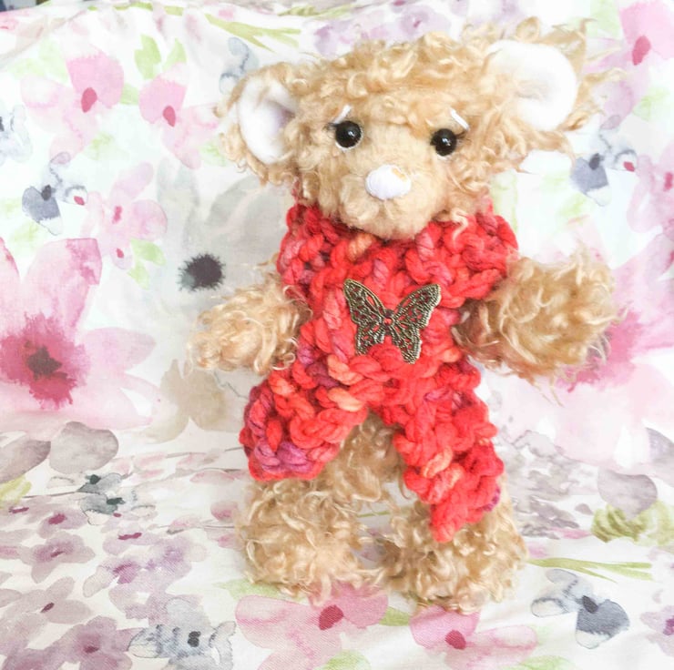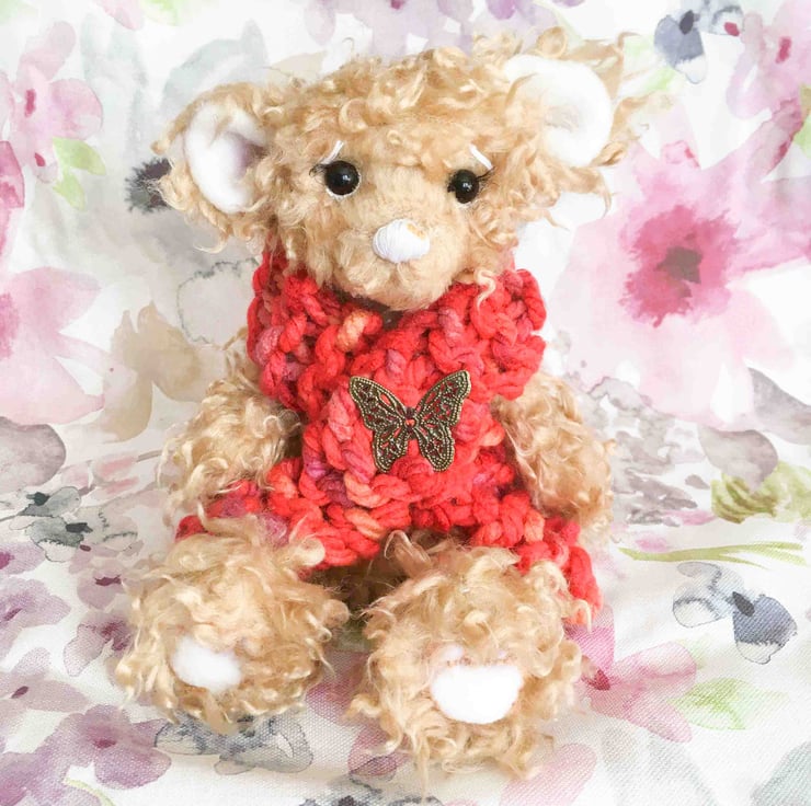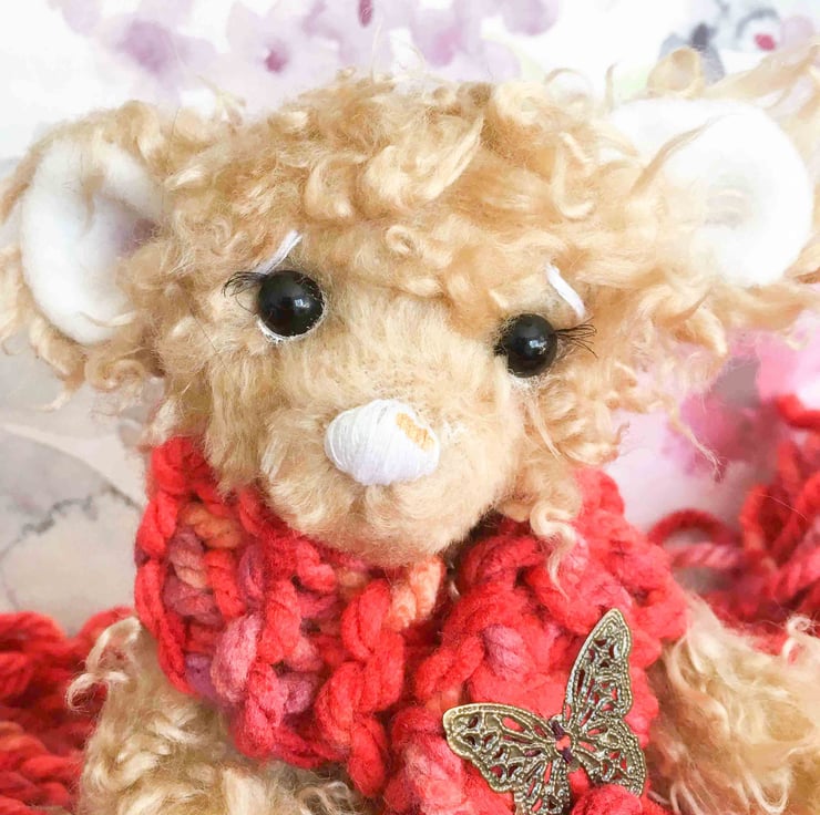 Pheobe is a beautiful little one of a kind bear that has been hand sewn with love from faux fur, she is weighted with pellets and has little fleece toes that have been delicatley needle sculpted. Pheobe is a snuggly little bear and loves to be cosy, she has a knitted scarf secured with a butterfly and comes with her very own super soft blanket that has been crocheted. She really is very sweet, she even has little blushes on her cheeks.