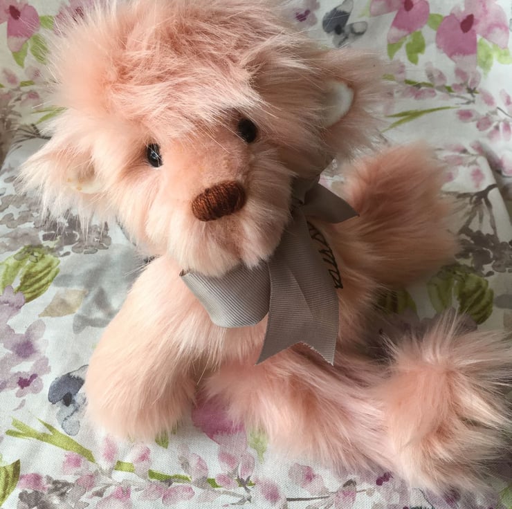 Rosie is a beautiful pink bear with a gorgeous grey bow and little trinkets around her neck that she has collected, a skeleton leaf and an engraved heart, she believes that they bring her luck.
