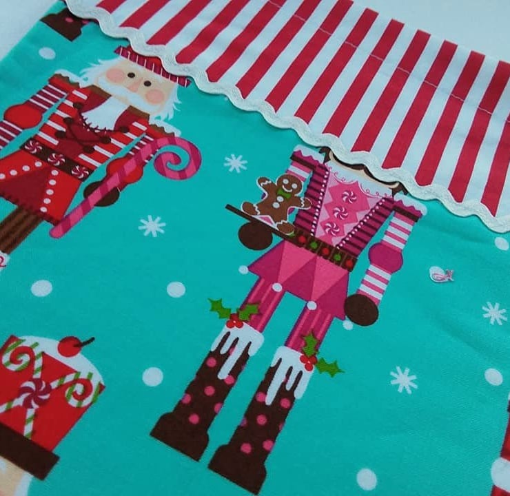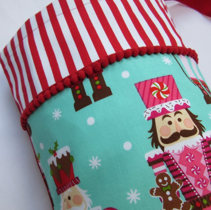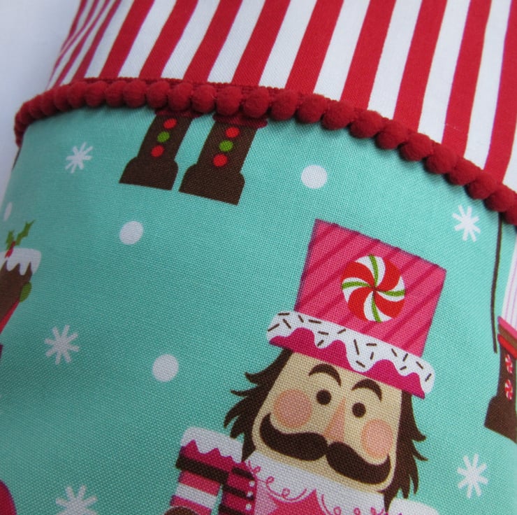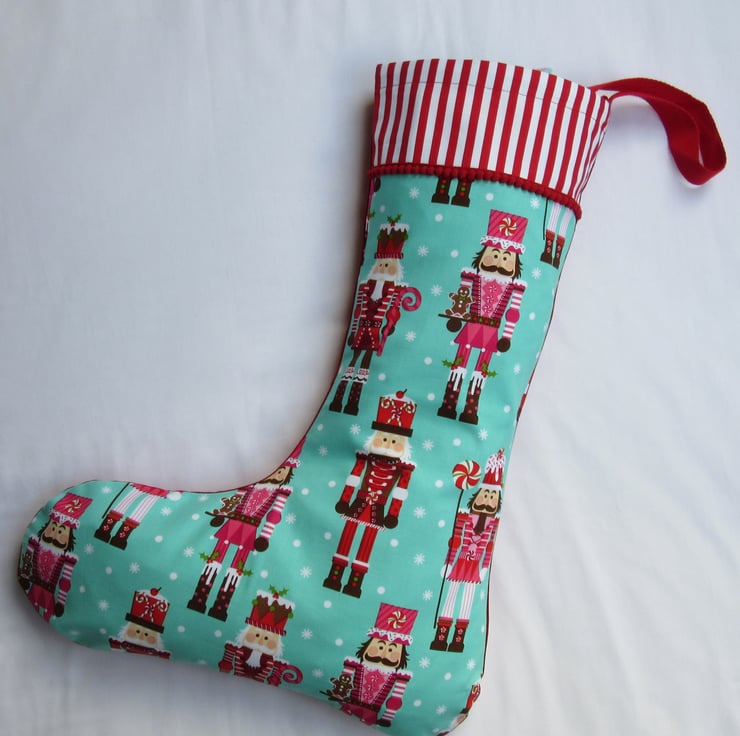 This front of your stocking features the beautiful Nutcrackers print from Michael Miller and is trimmed with mini pom pom trim. (Exact placement of fabric design will vary.) Backed in dark aqua or red cotton and lined in white, the stocking has a hanging loop so it can be hung up for display before filling with gifts.
