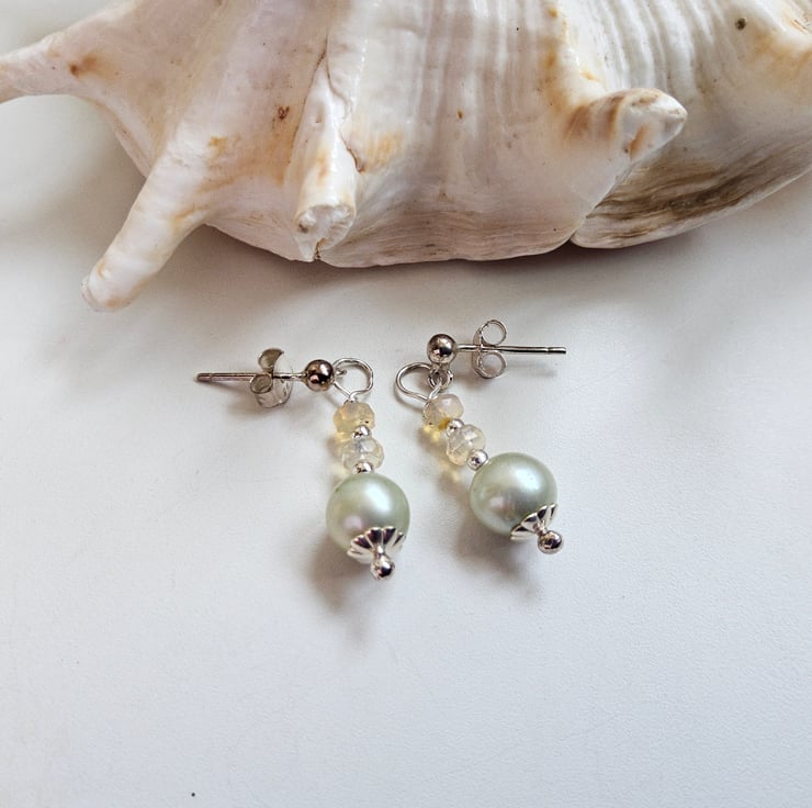 A very pretty dainty eye catching pair of earrings designed and hand crafted using 8mm mint green freshwater pearls complimented with quality faceted genuine Ethopian Wello opal rondelle cut gemstones. All other components are 925 sterling silver.