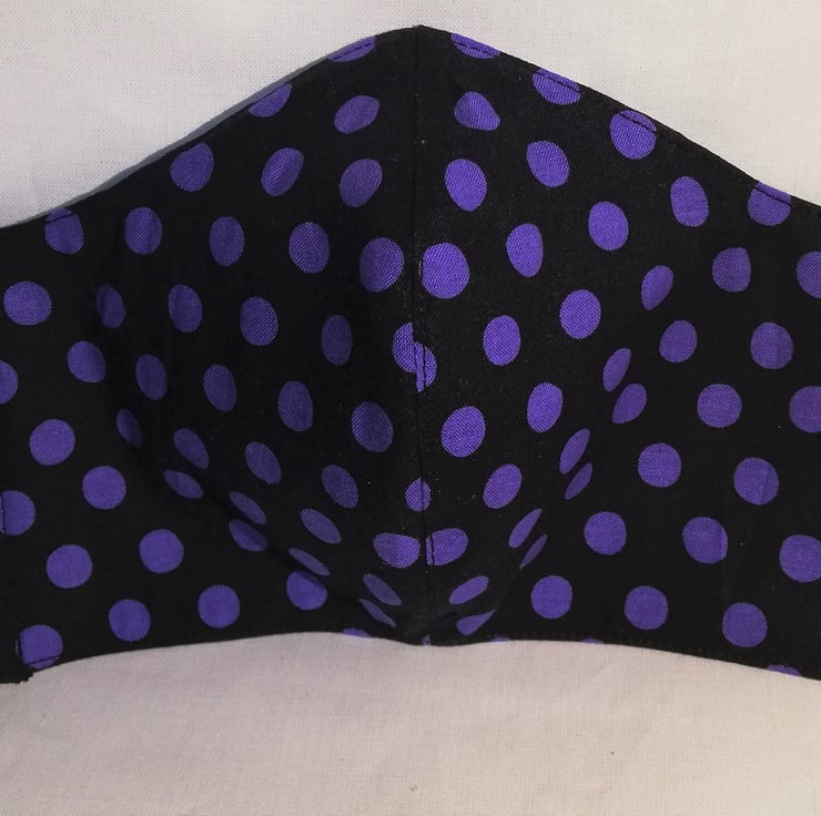 Hand made 100% cotton triple layer face mask. Reusable and washable with a nose wire that can be removed prior to washing. This is made with 3 layers of cotton. The outside layer is a printed cotton in black, dotted with purple spots. The other 2 layers are both a matching black cotton.