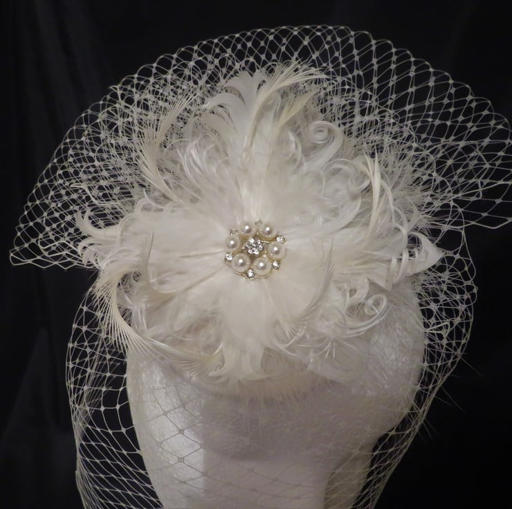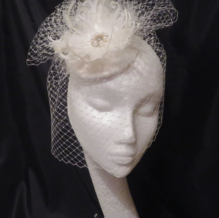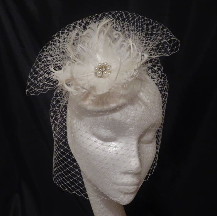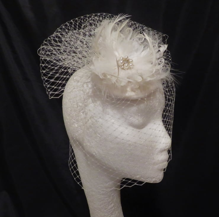 Created with layered handsewn puffs of ivory classic veiling, with a piece dropping at the front which comes to the end of the nose, straight across when worn on the top of the head or at a slant across the face if worn to the side.