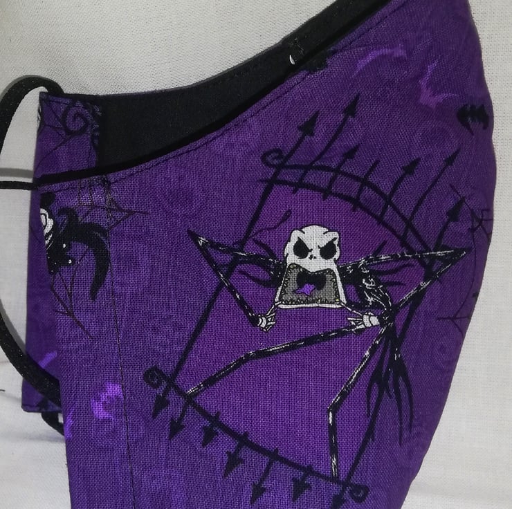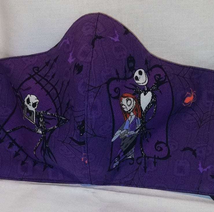 Hand made 100% cotton triple layer face mask. Reusable and washable with a nose wire that can be removed prior to washing. This is made with 3 layers of cotton. The outside layer is a printed cotton in purple with Jack Skellington and Sally. The other 2 layers are both a matching purple cotton.