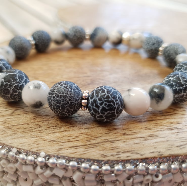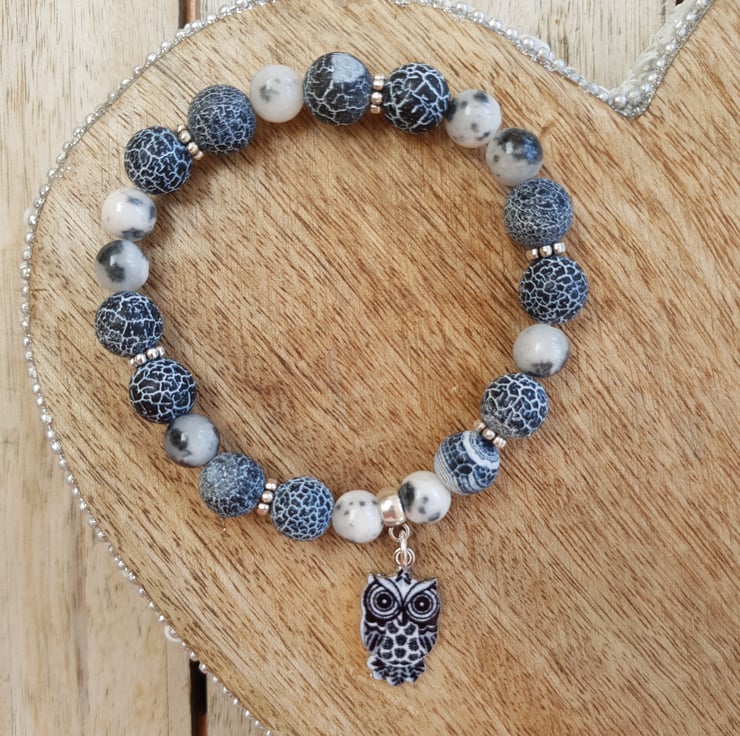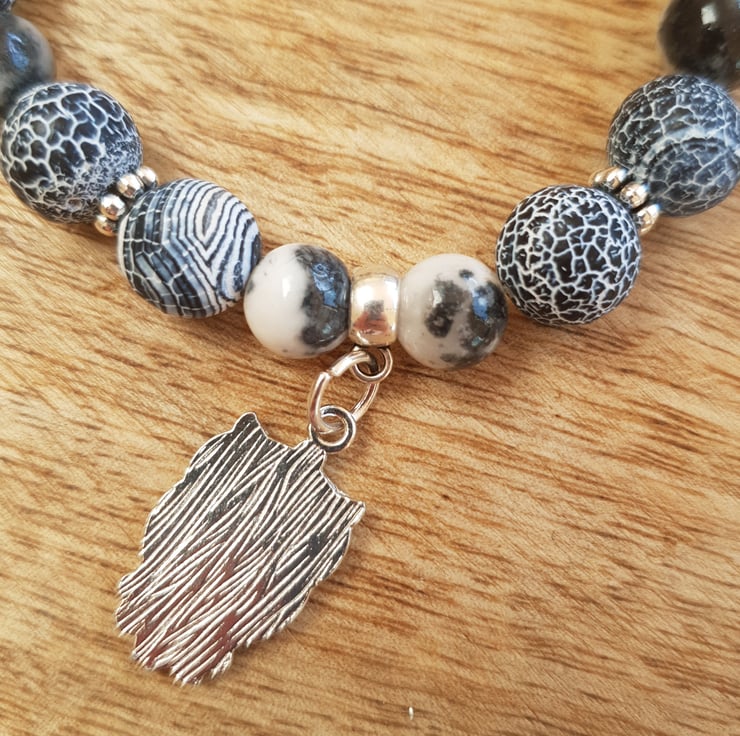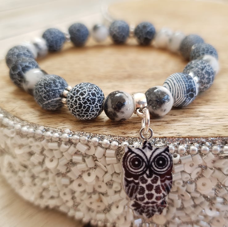 This is such a striking bracelet and the mix of beads is really stunning! The matt frosted crackle effect agate beads are really unusual and pair perfectly with the watercolour look jade beads. The silver plated bead spacers dotted throughout add a touch of shine but the real star of the show is the beautiful monochrome owl charm. He is just so sweet! (please note - printed monochrome design one side and brushed silver on the reverse)