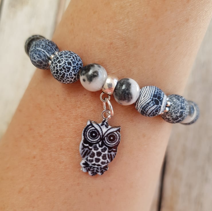 Stunning Monochrome Agate and Jade Mixed Bead Stretch Bracelet with Sweet Owl Charm.