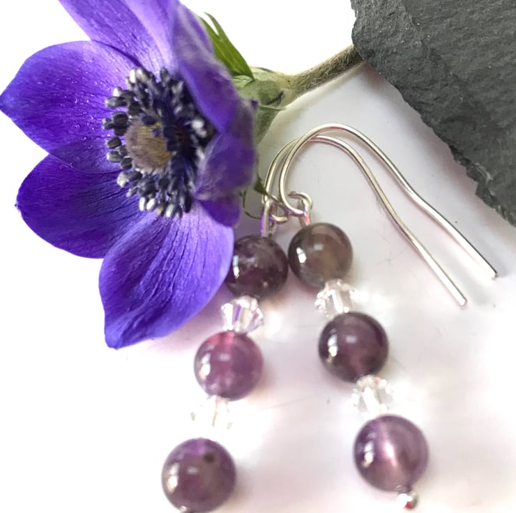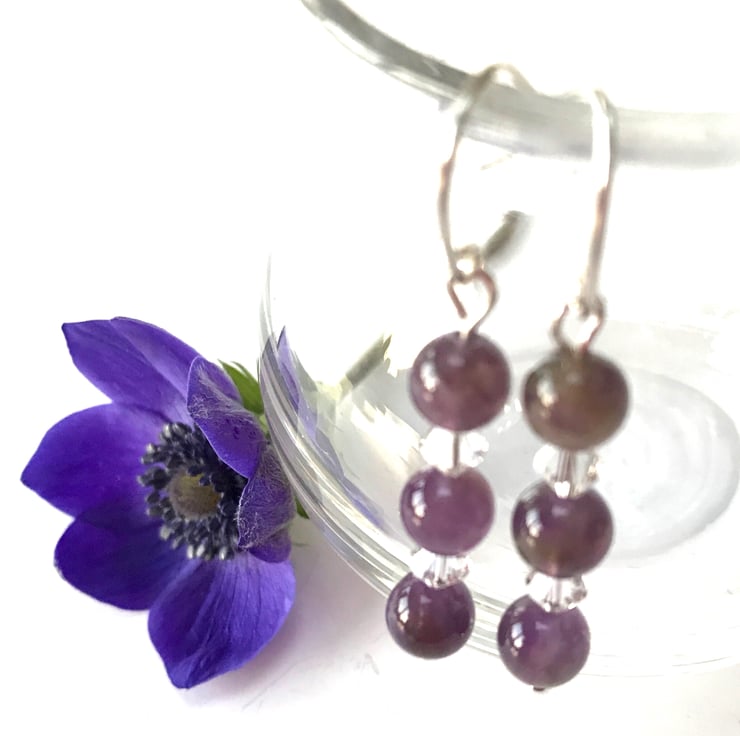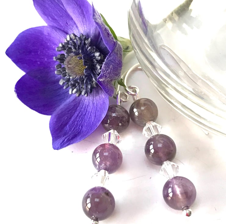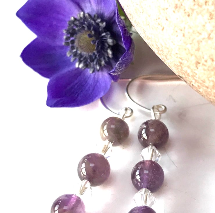 These elegant earrings are made from sterling silver with deep purple Amethyst gemstones and Swarovski crystals. They have handcrafted sterling silver fittings. The perfect gift for any occasion.