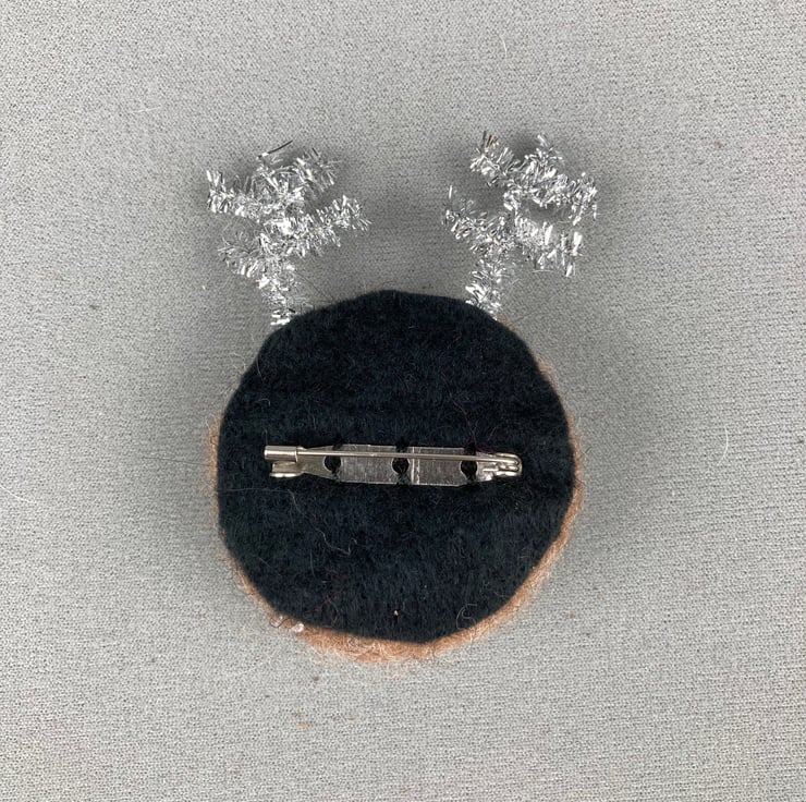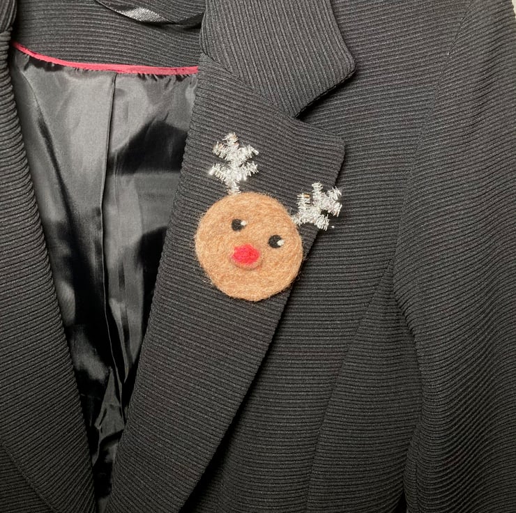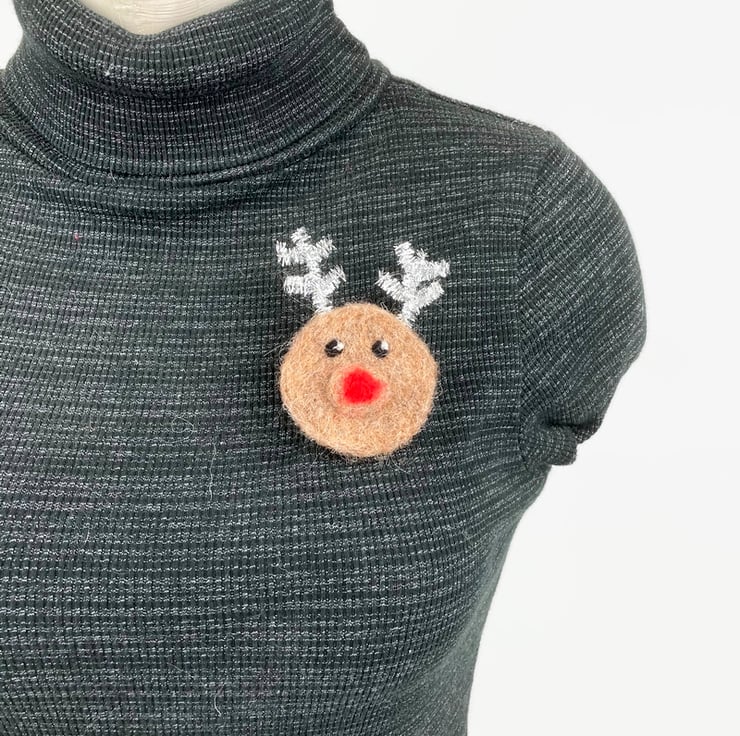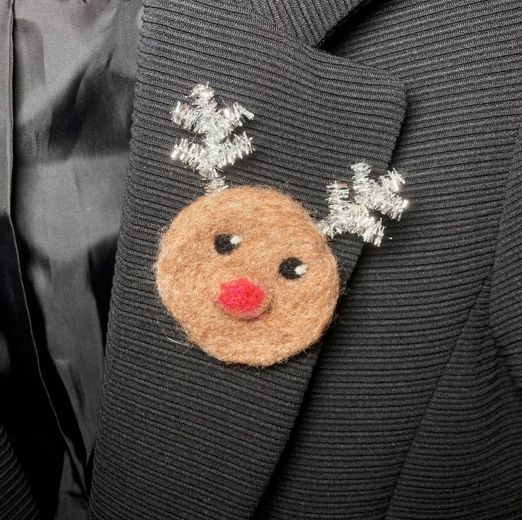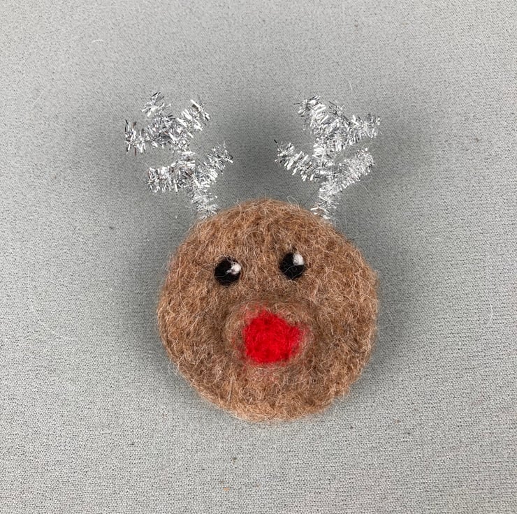 A fun way to join in the festive season. This reindeer brooch has been needle felted using woollen fibres and a barbed felting needle. The reindeer has a red nose and silver sparkly antlers. Pop him on your lapel this Christmas and put a smile on the faces of others.