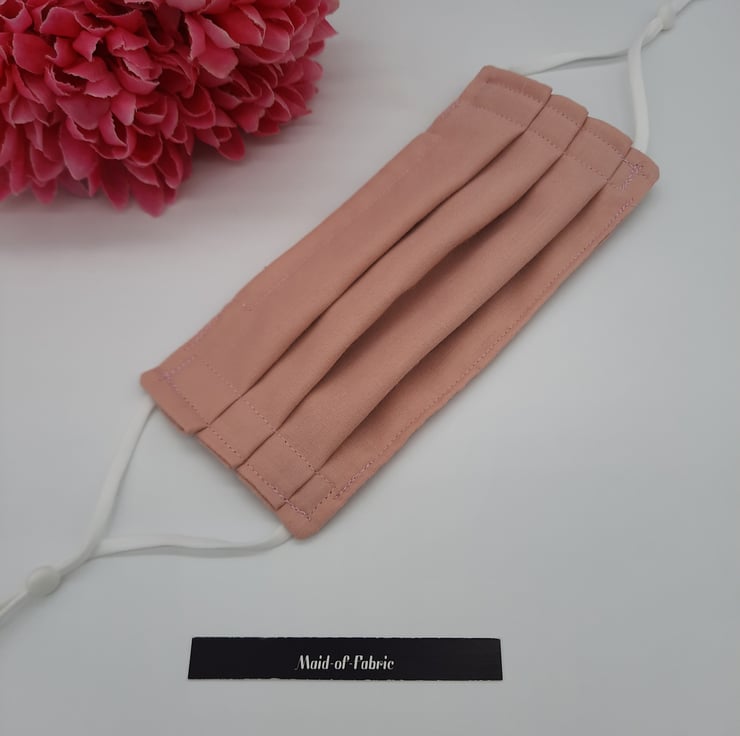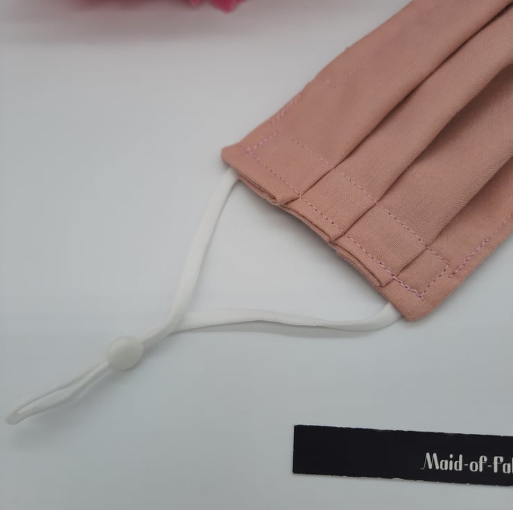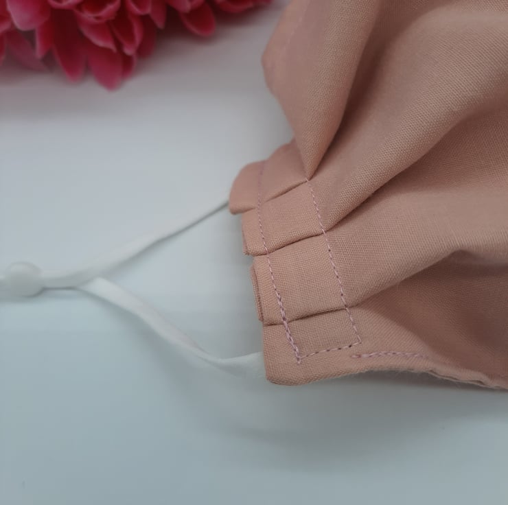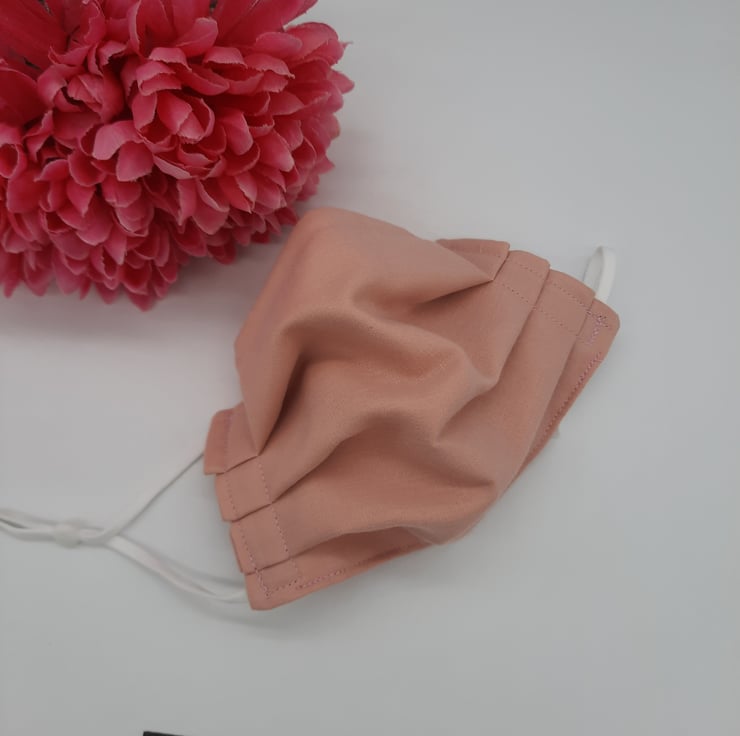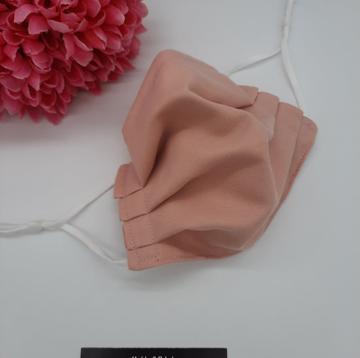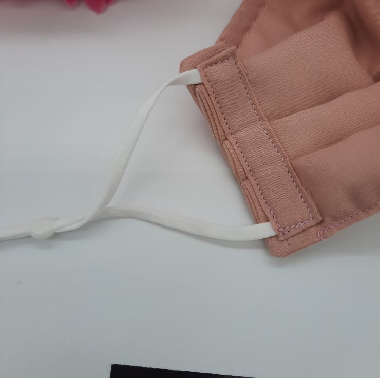 Small face mask made using a pink cotton fabric, adjustable soft white elastic and a 9cm flat bendable nose wire.