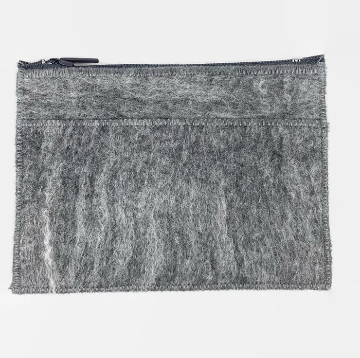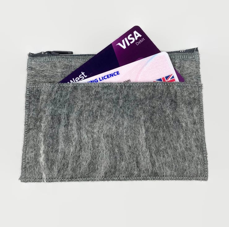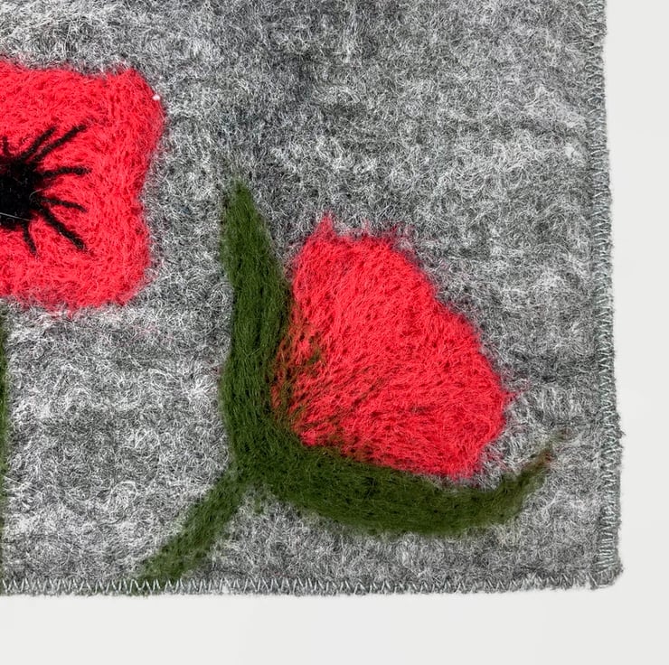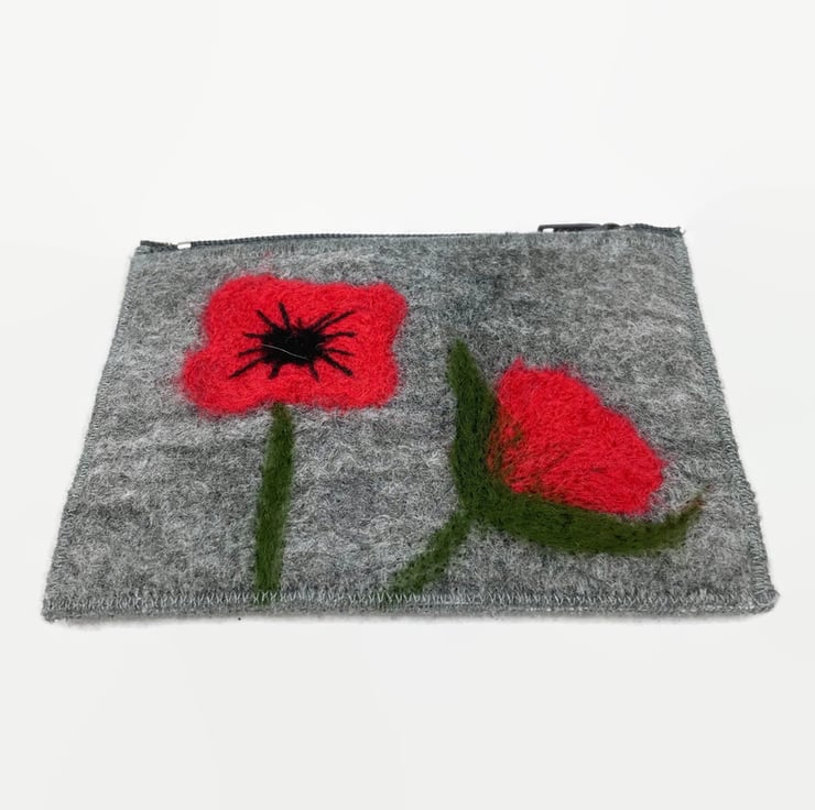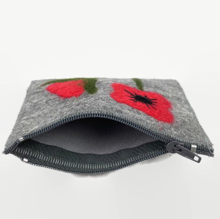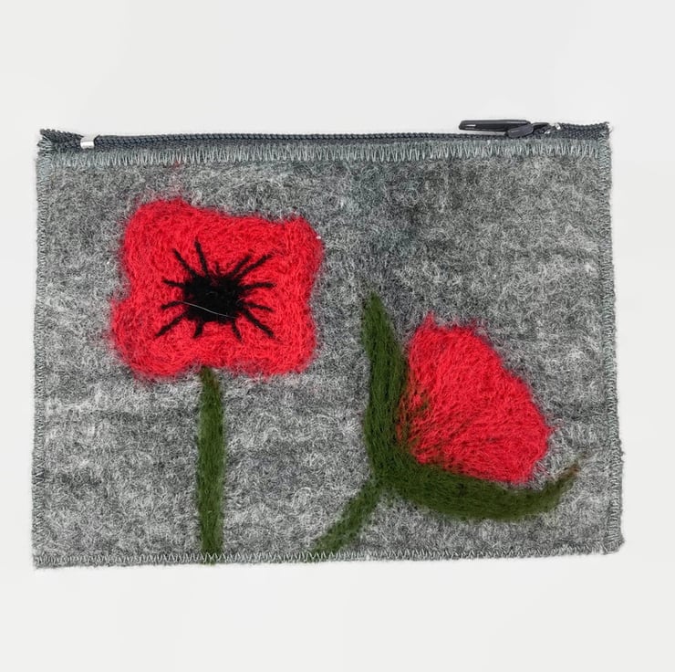 Made using a piece of hand made grey merino wool felt, this purse has two large poppies needle felted to the front - one in bloom and the other just opening. The main compartment of the purse is secured with a zip fastening and the reverse of the purse is an additional compartment for the storage of bank cards etc. The purse is lined with a hardwearing grey fabric. The purse has been sewn together using an external overstitch to reduce bulk.